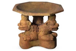 Resting on a trio of foo dogs, this bird bath adds a touch of Asian appeal to your outdoor oasis. Crafted of Fiber Stone, in which sand and pebbles are cast into fiberglass to create the appearance of aged stone, it weighs much less than stone and is more durable than concrete. Made in the USA.