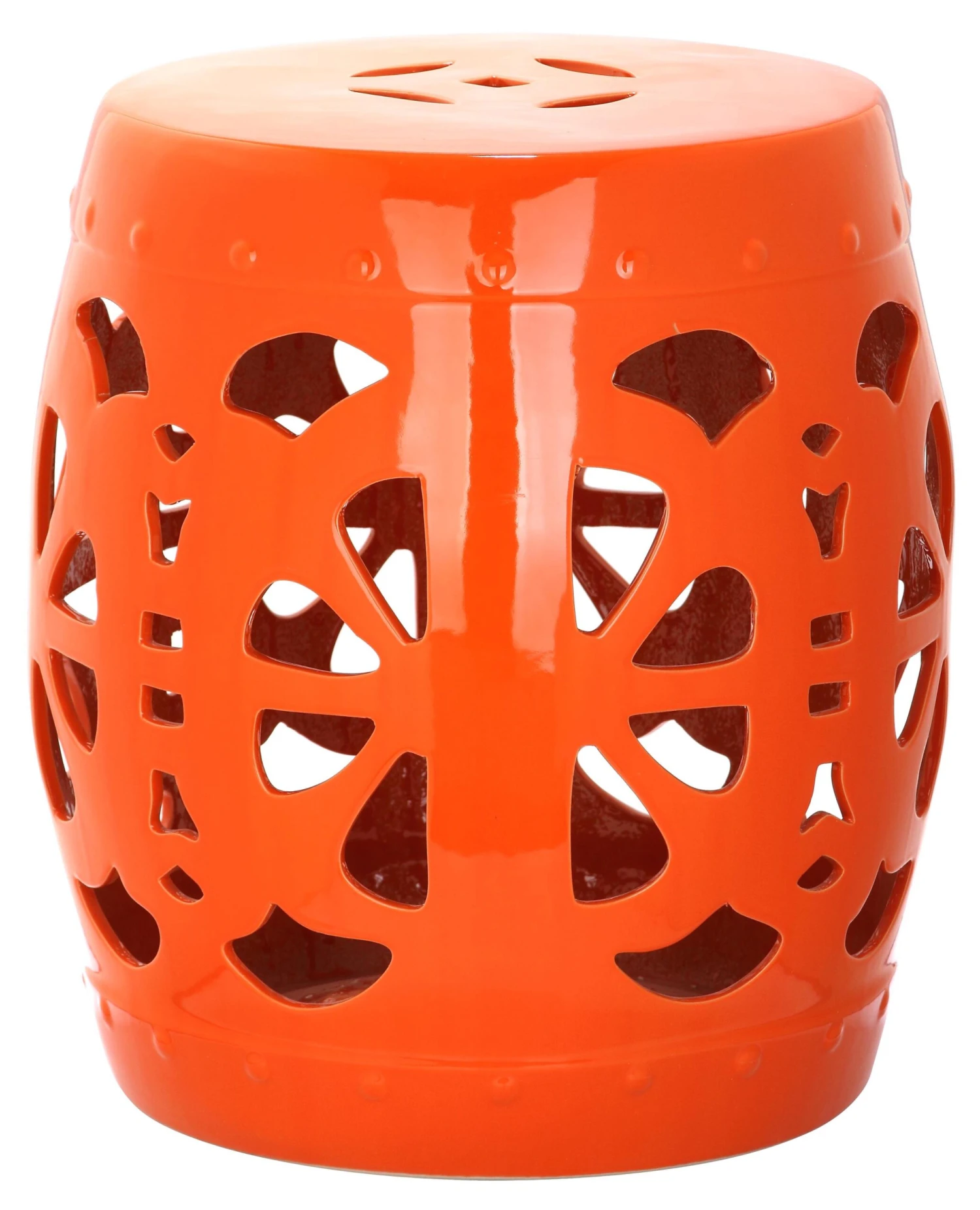 The endlessly versatile garden stool gets a fresh, modern look with bold, floral cut-outs and a vivid orange glaze.