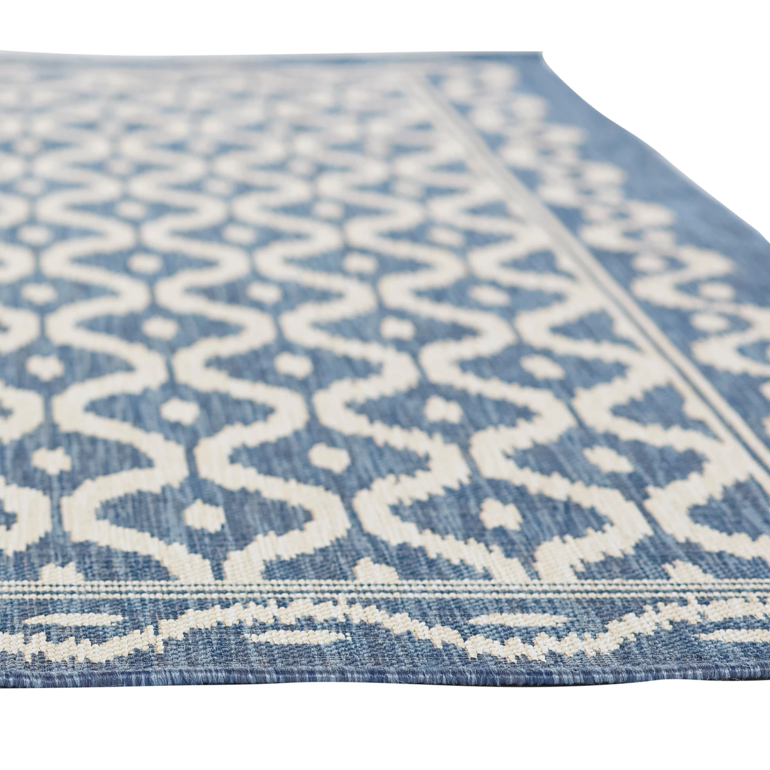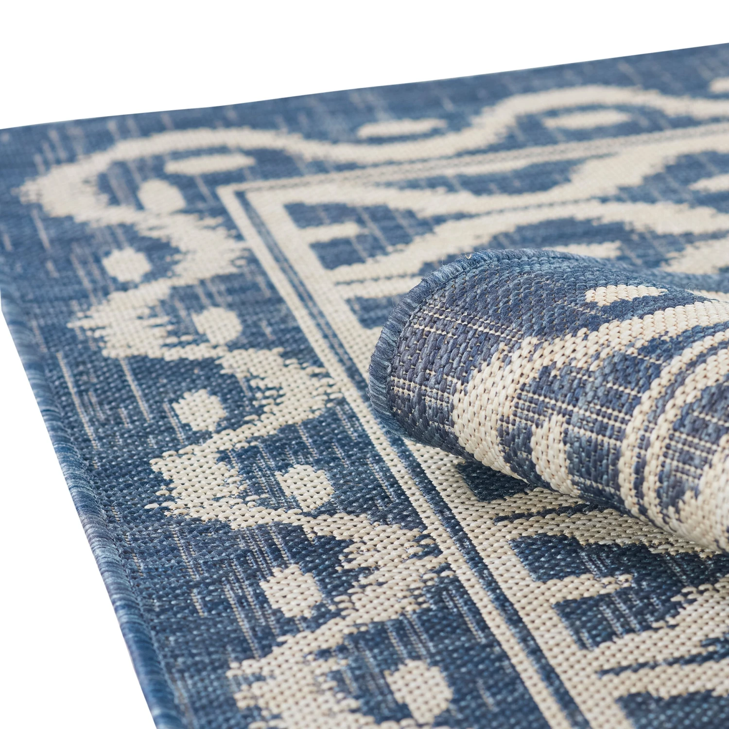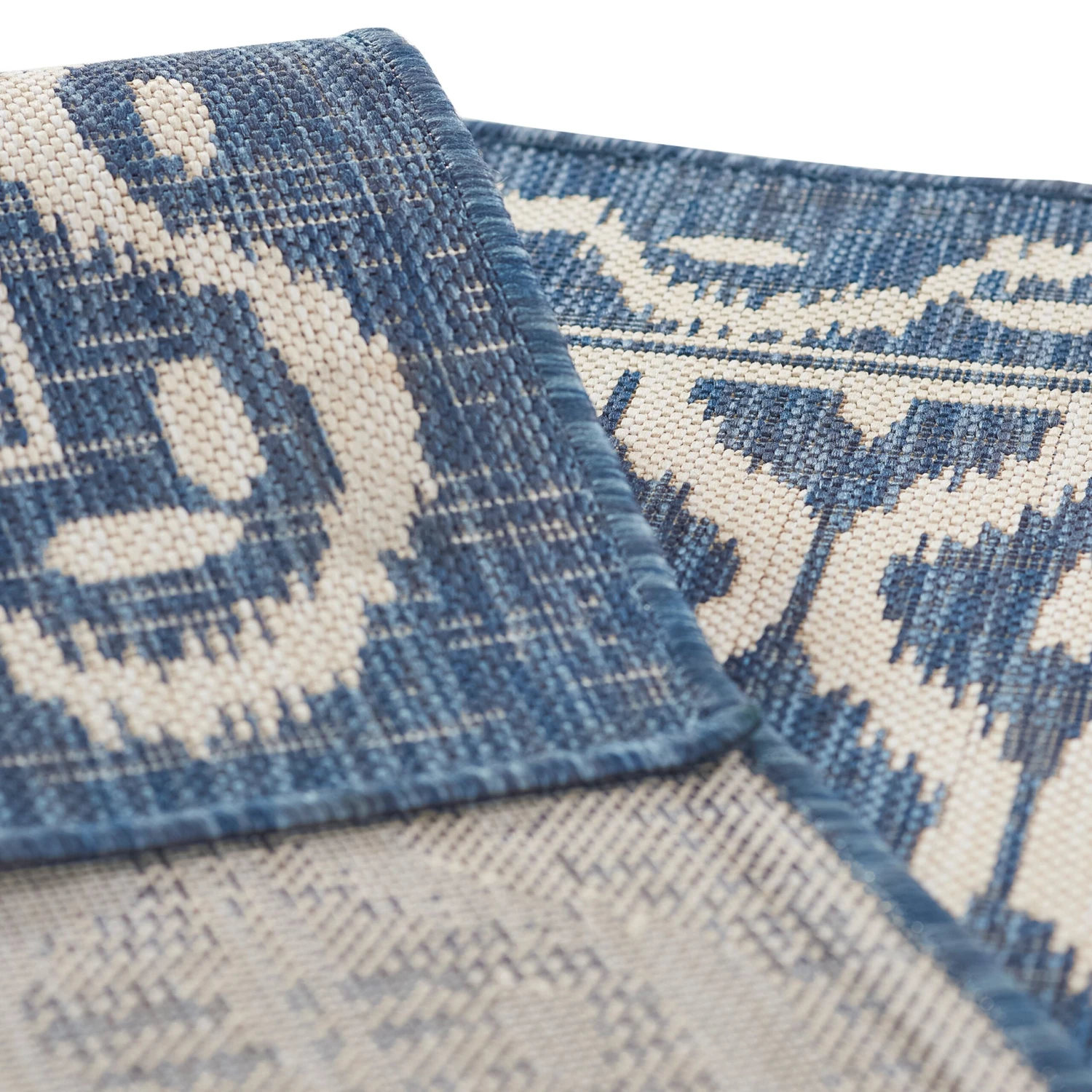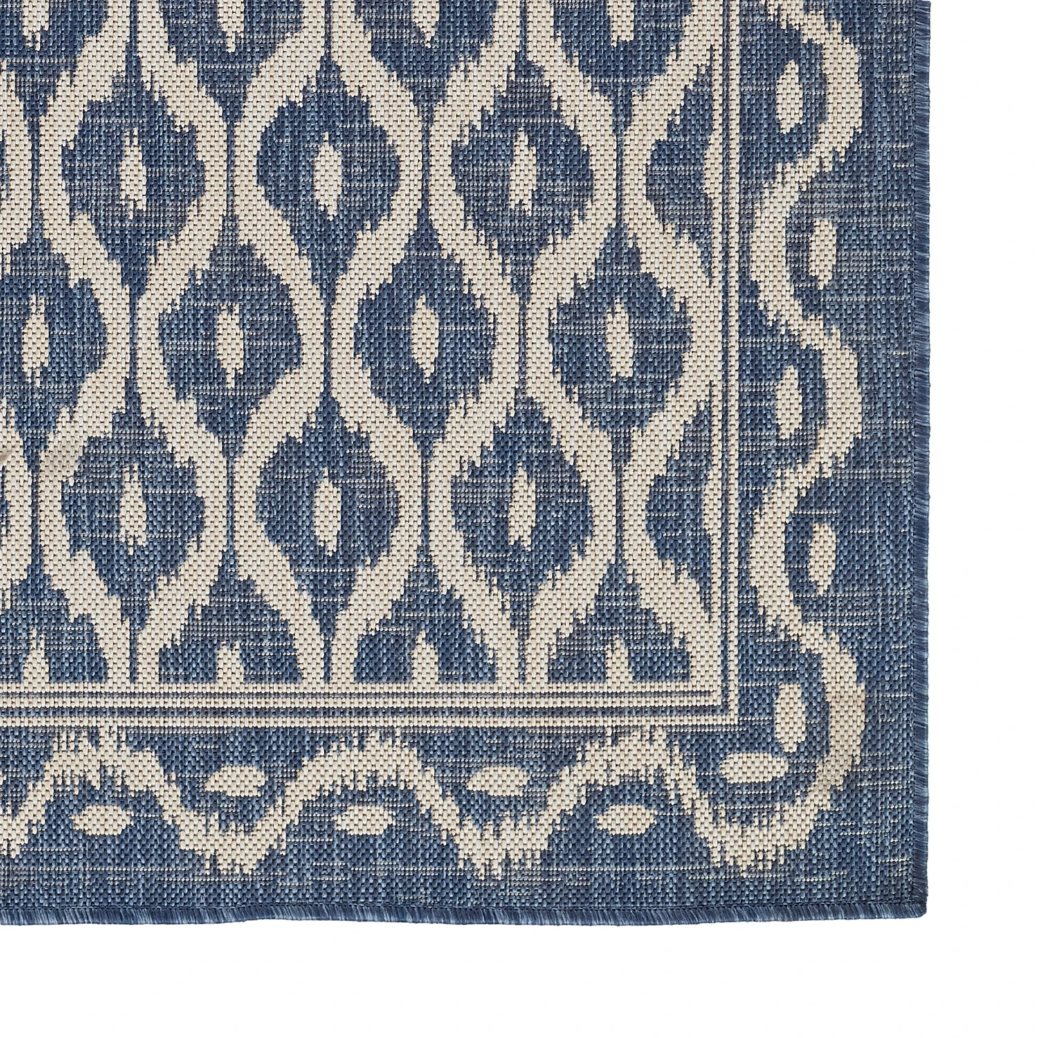Made of stain-resistant, fade-resistant, mold-resistant polypropylene, this rug can withstand the elements and heavy traffic. Its ikat-inspired motif will complement a poolside, a patio, a mudroom, or a playroom with aplomb. A rug pad is recommended to prevent slipping.