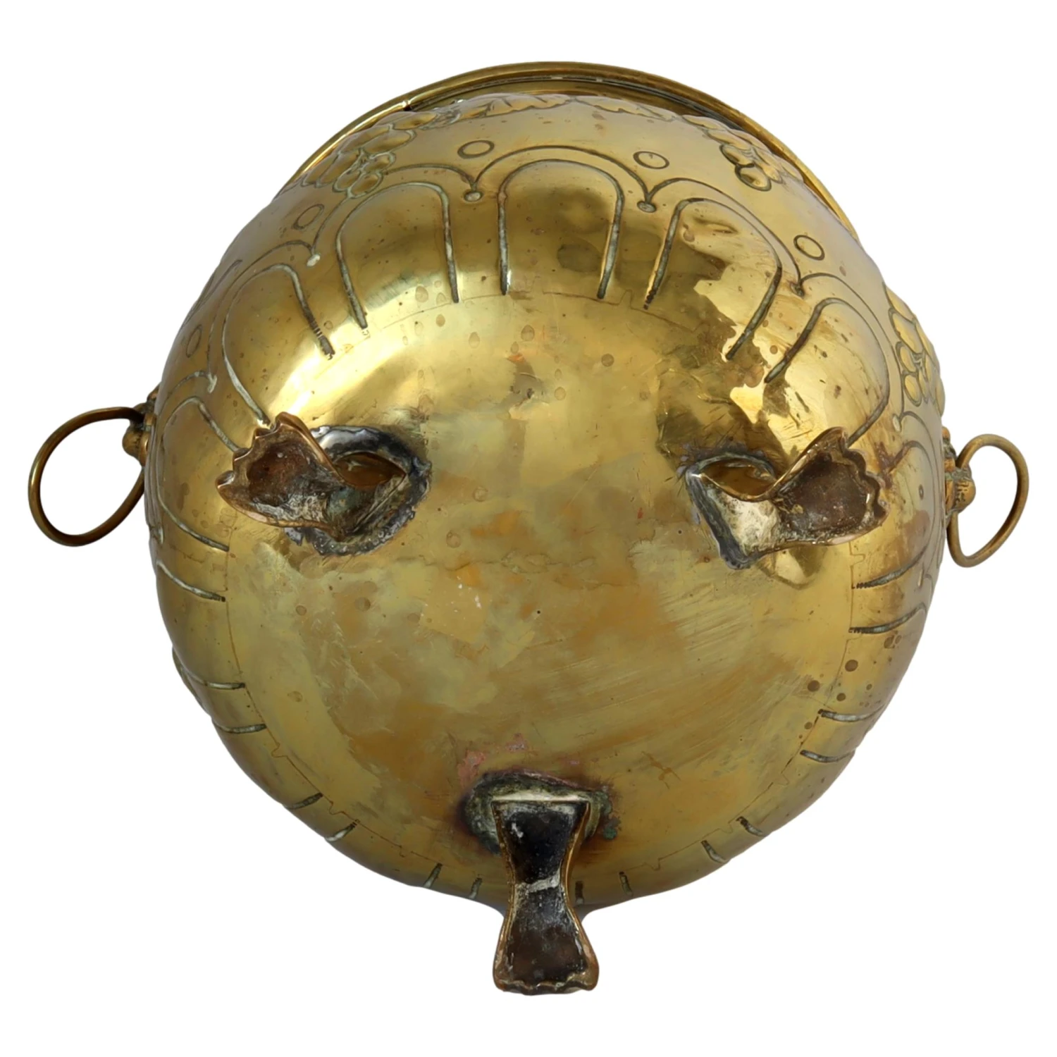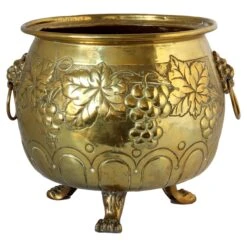 Antique english brass plant pot with lion knocker handles. Natural aged patina left intact for trending look, can be highly polished if desired.