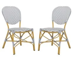 Bring French flair to your outdoor collection with these rattan-wrapped side chairs, framed in weather-proof aluminum with woven gray-and-white seats and banded joints. This set stacks for easy storage.
