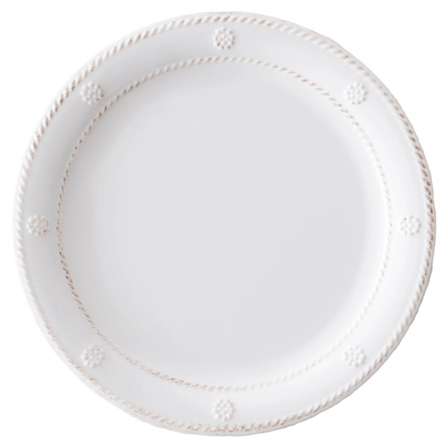 Beautifully detailed and finished in white, this plate is crafted of shatterproof melamine, making it an ideal option for dining both indoors and out.