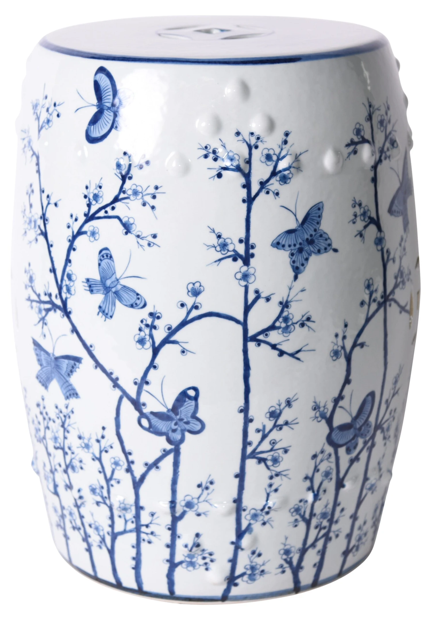 Crafted of high-fired porcelain for exceptional durability, this versatile garden stool is glazed in white and decorated with blue butterfly designs. Suitable for indoor and outdoor use.