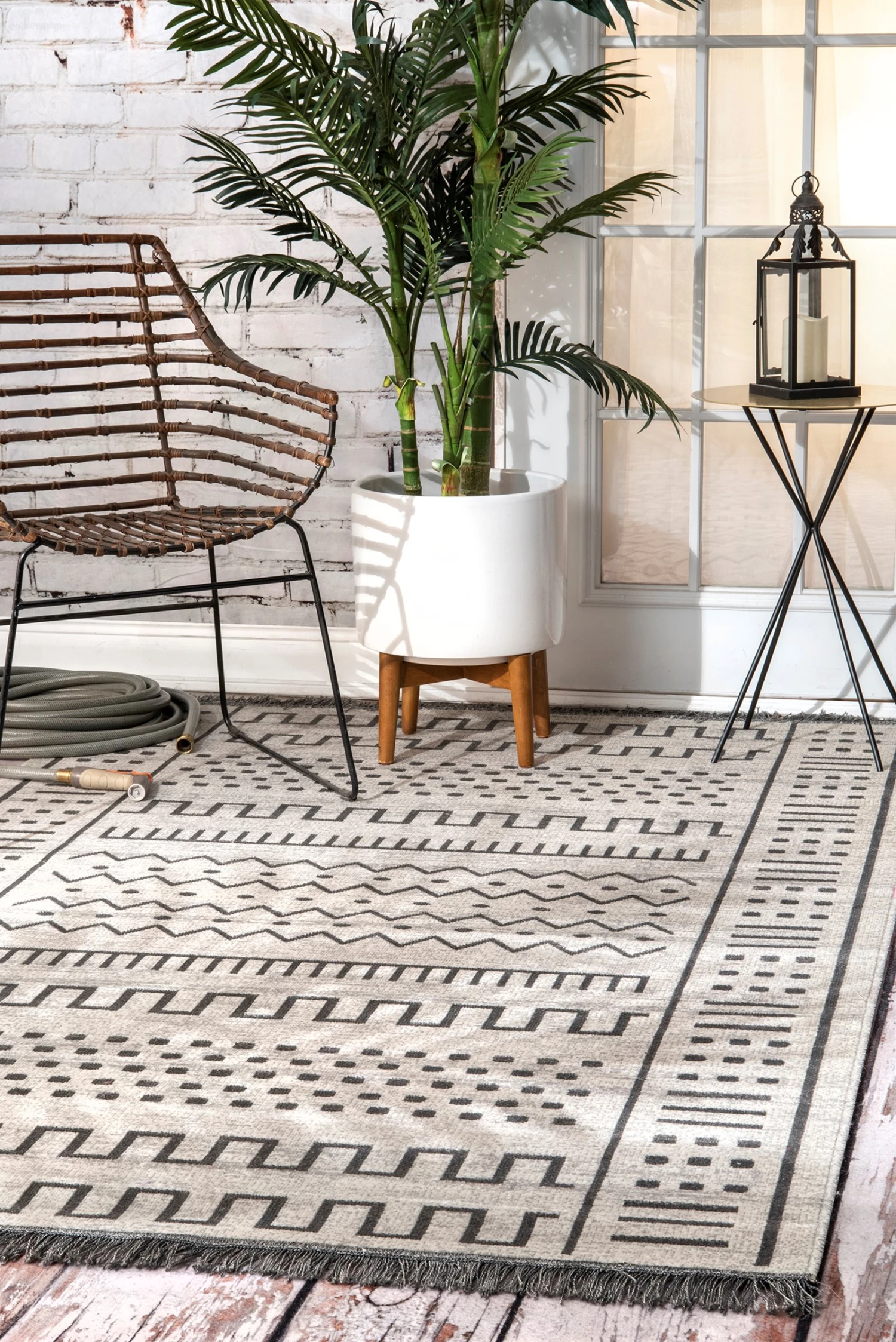 Featuring a tribal-inspired design, this outdoor rug is made of durable polypropylene, an easy-to-clean material that can withstand the elements and resists wear and tear. Perfect for use on the porch or patio, it can also be brought indoors to protect flooring in high-traffic areas.