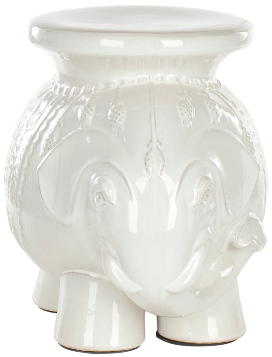 Delightfully detailed, this ceramic elephant can serve as a handy surface for books and a drink, a pedestal for a favorite object, and even extra seating in a pinch.