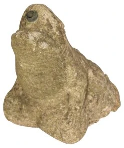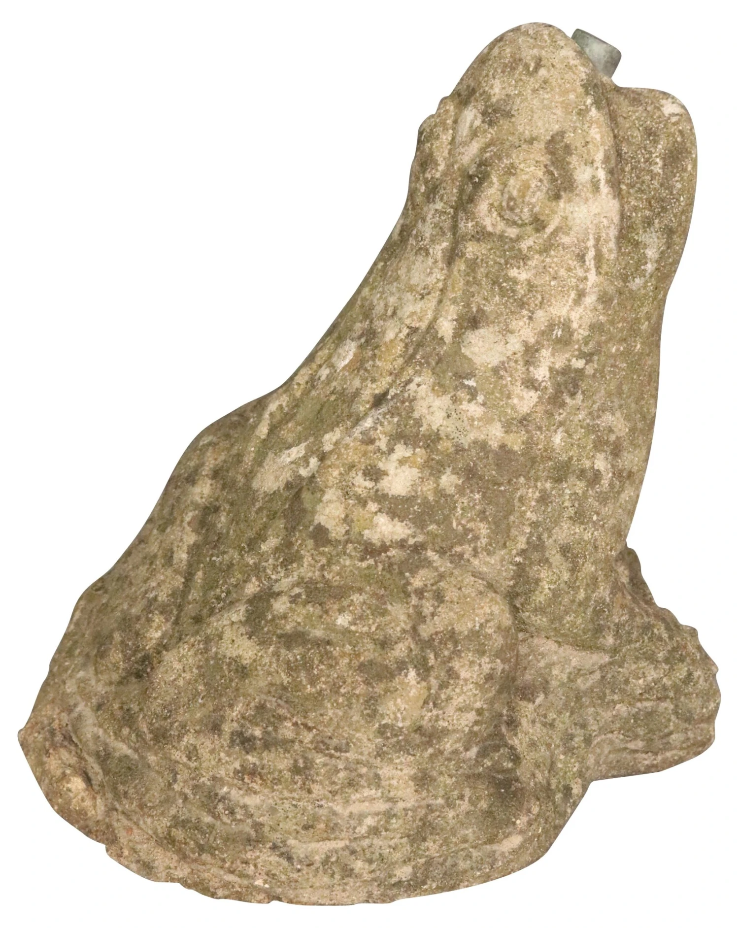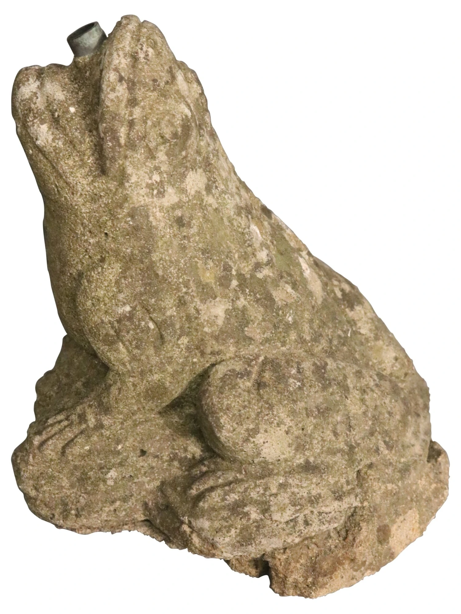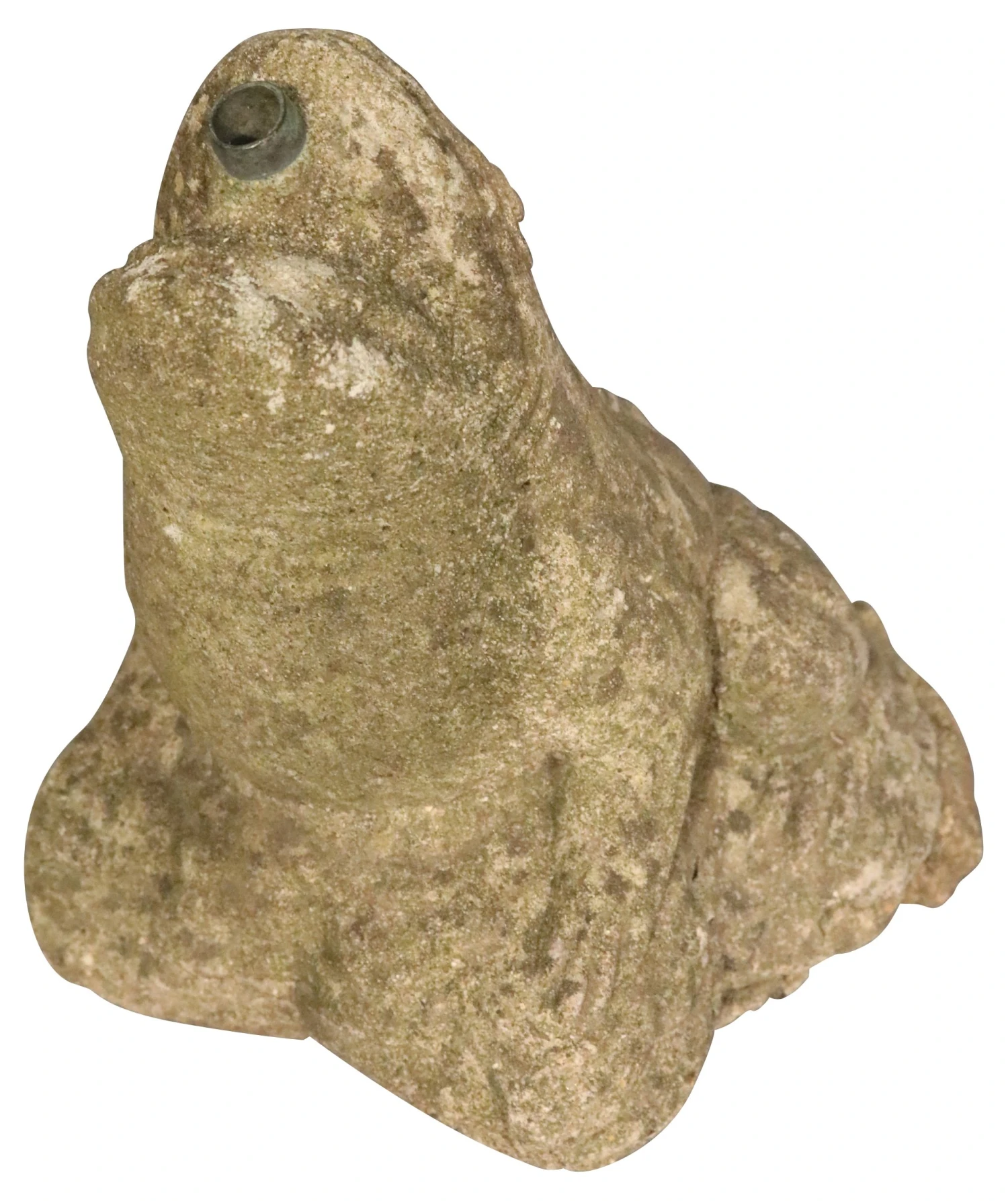 English cast stone garden fountain head in the form of a frog dating from the middle of the 20th century. Overall patina with moss and lichen. Minor age wear.