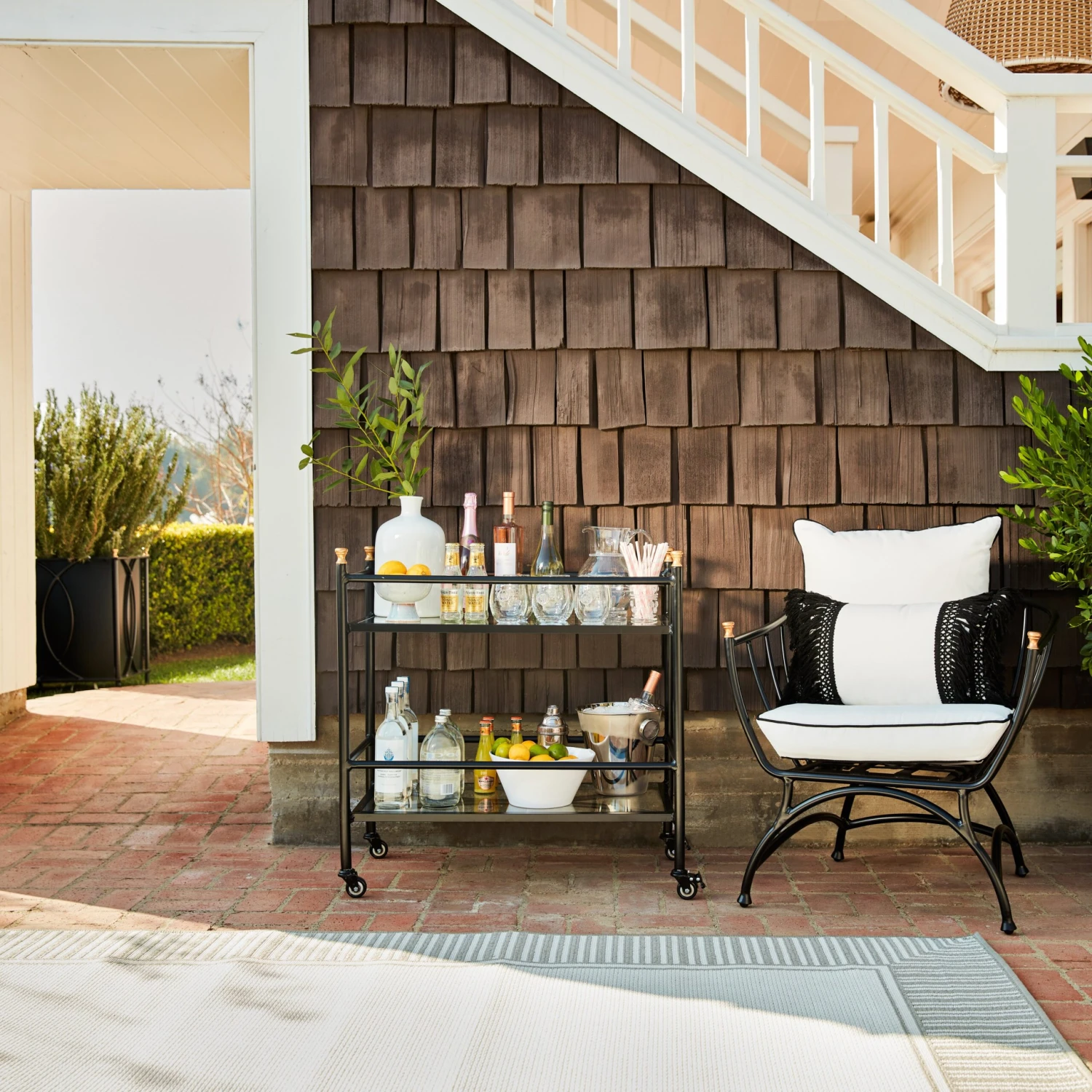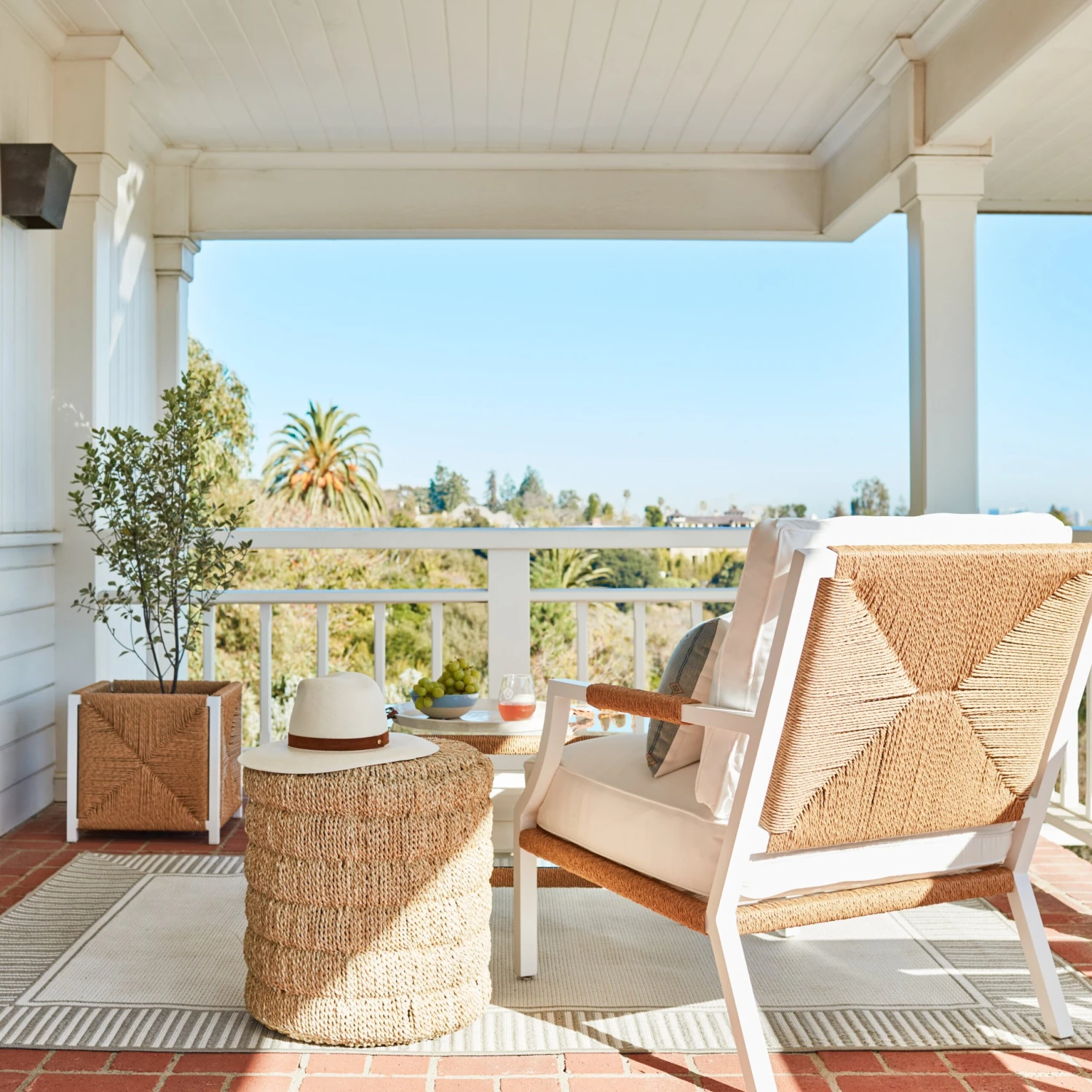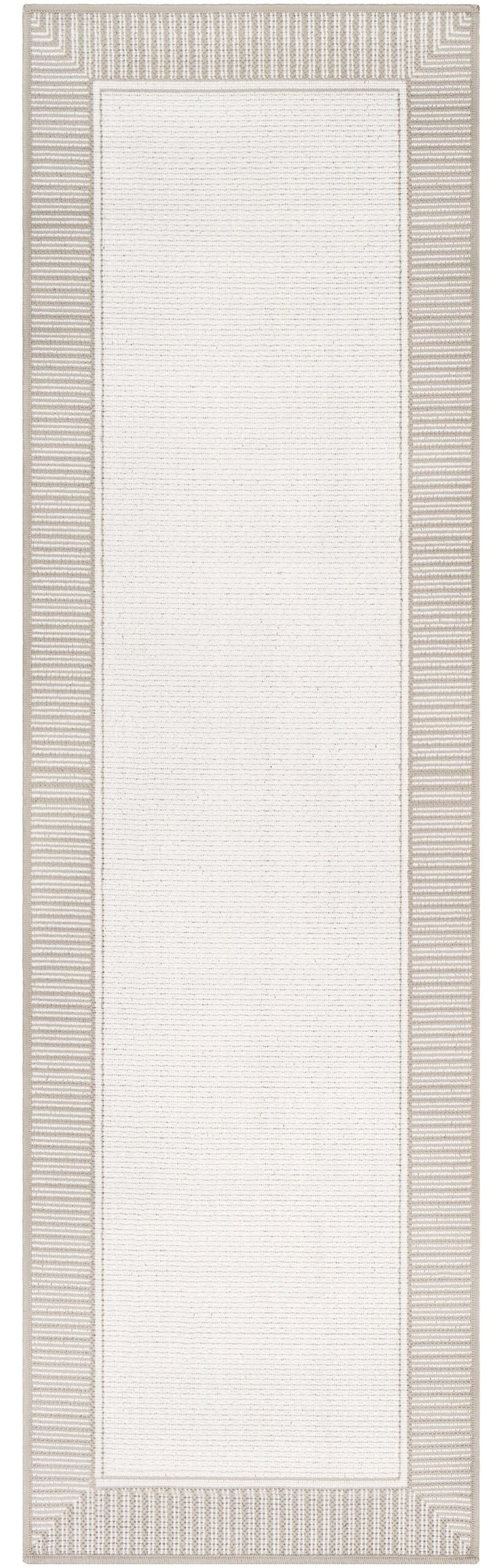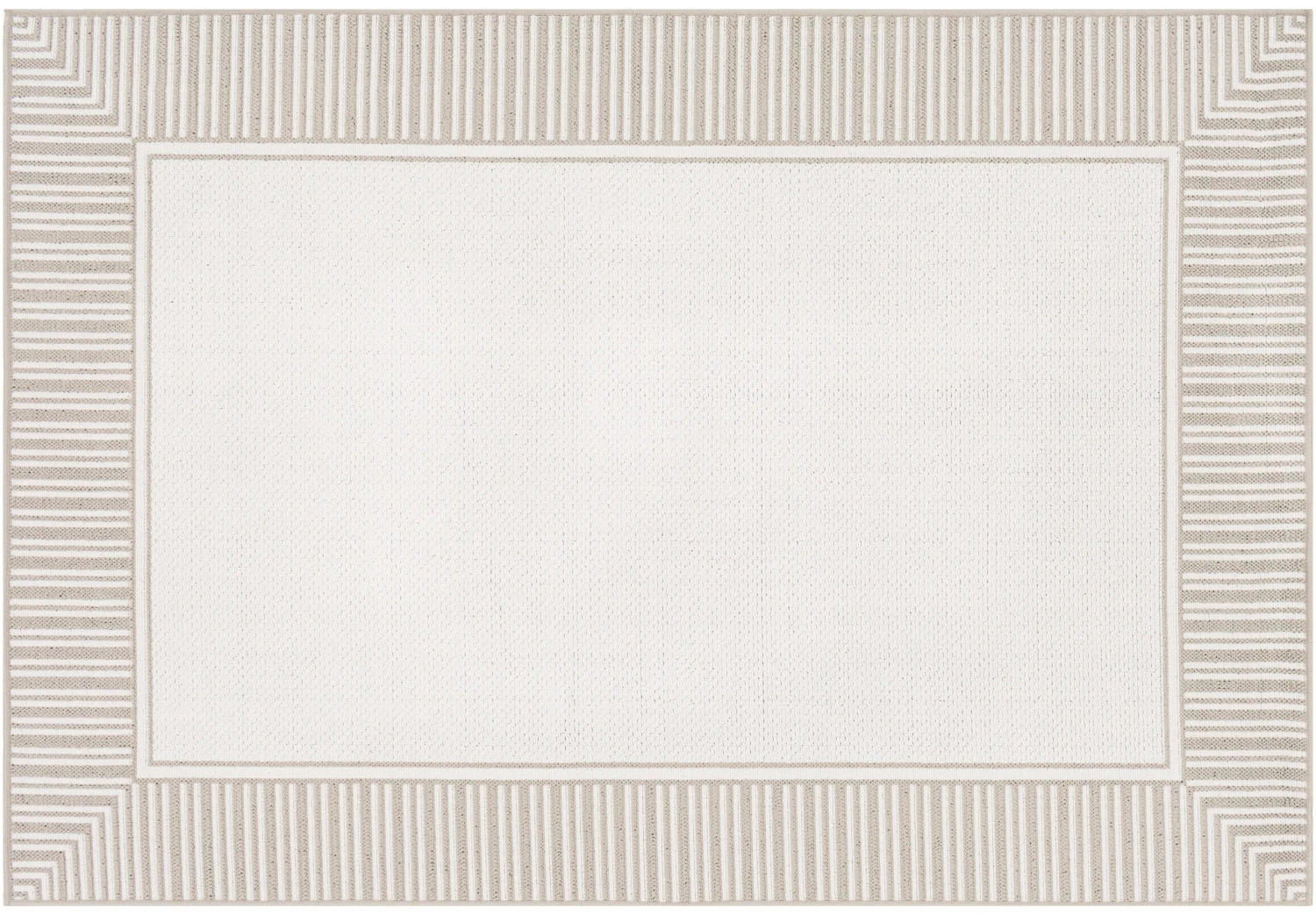 Framed with a striped border, this neutral-hued outdoor rug is made of durable polypropylene, an easy-to-clean material that can withstand the elements and resists wear and tear. Perfect for use on the porch or patio, it can also be brought indoors to protect flooring in high-traffic areas.