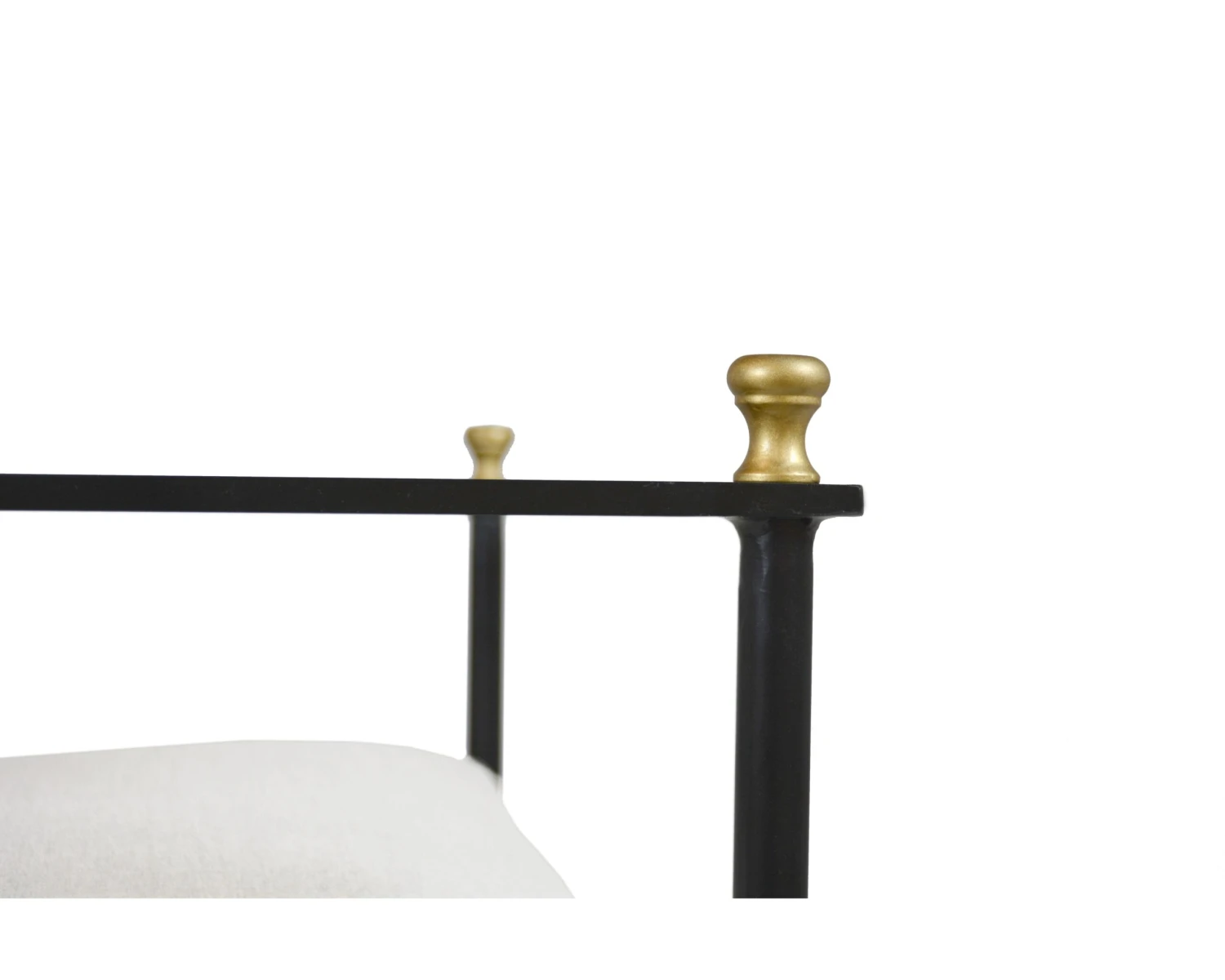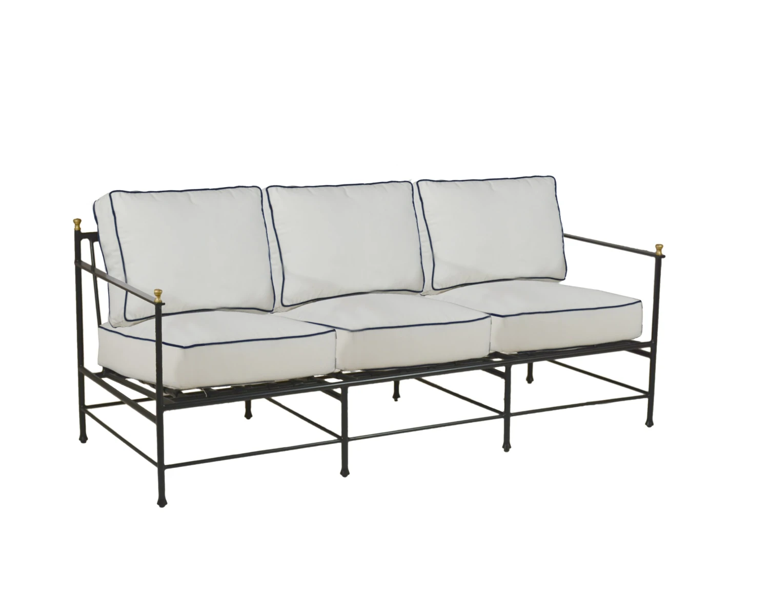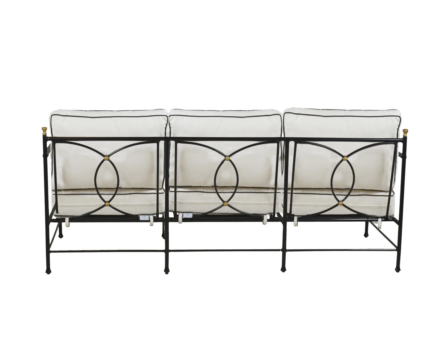 Designed by us and available only at One Kings Lane: Inspired by Belle Époque elegance, this three-seater outdoor sofa pairs a matte black finish with golden finials.