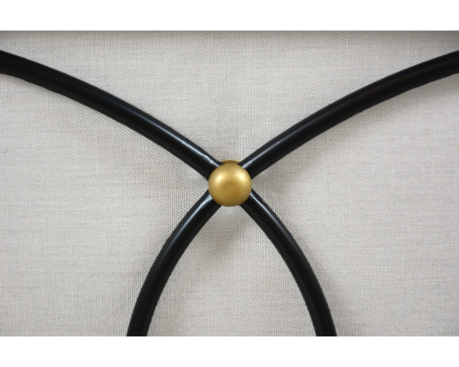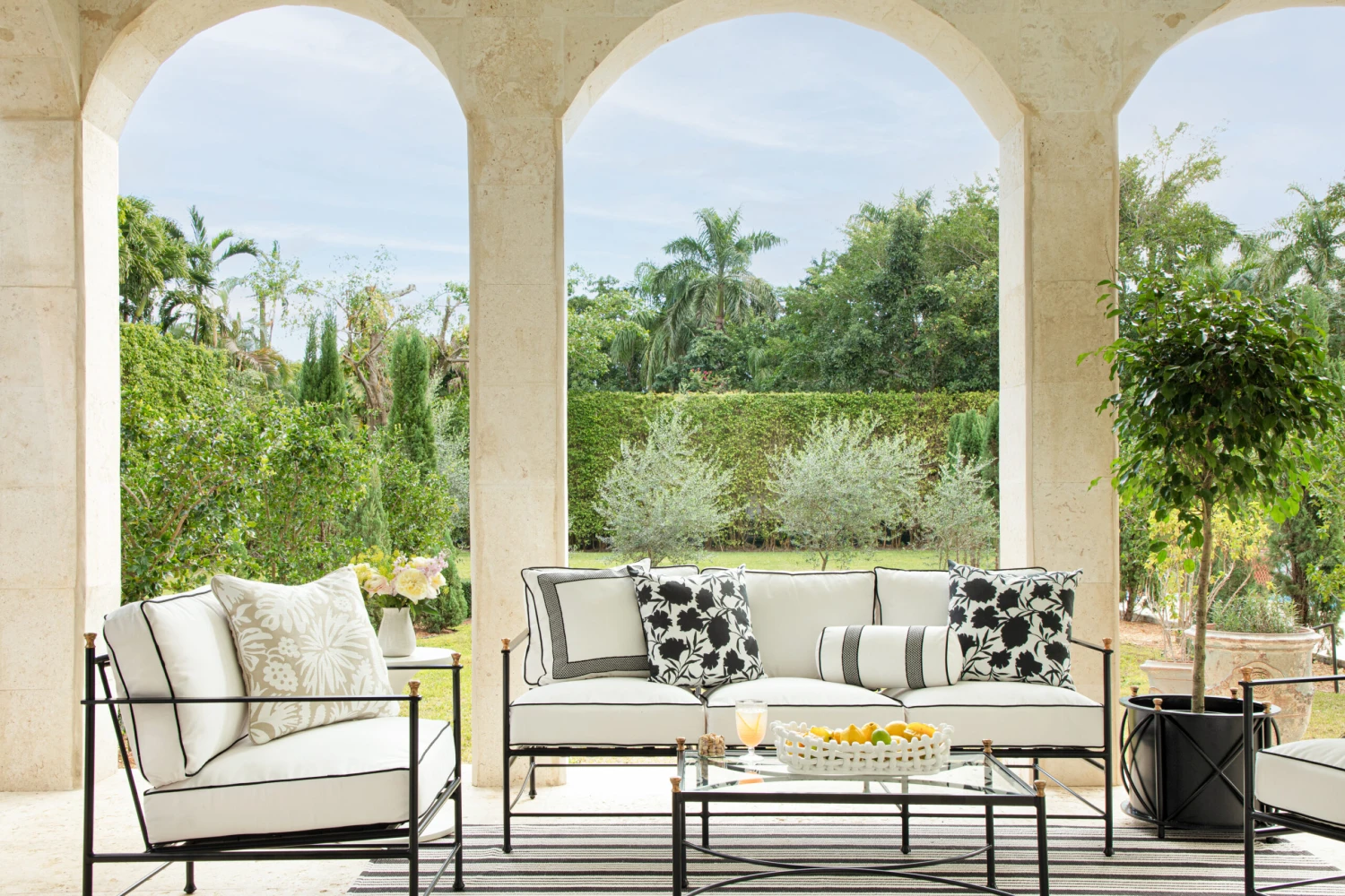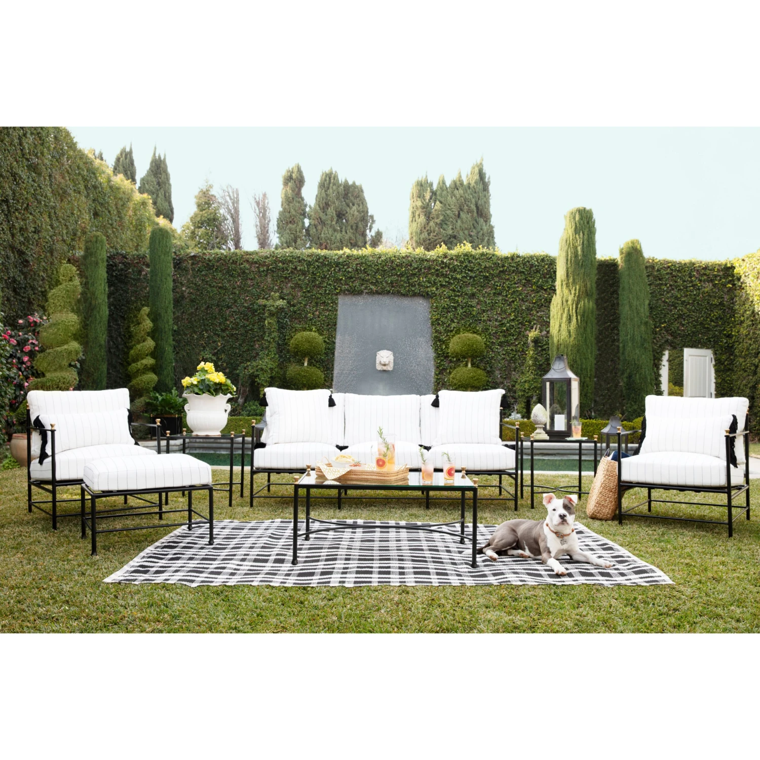 Designed by us and available only at One Kings Lane: Inspired by Belle Époque elegance, this three-seater outdoor sofa pairs a matte black finish with golden finials.