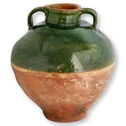 Very heavy antique French confit pot with green half-glaze. These are always fraught with age wear. This one has had hairlines and cracks professionally bonded and sealed, making them stronger than they were originally. No maker’s mark.