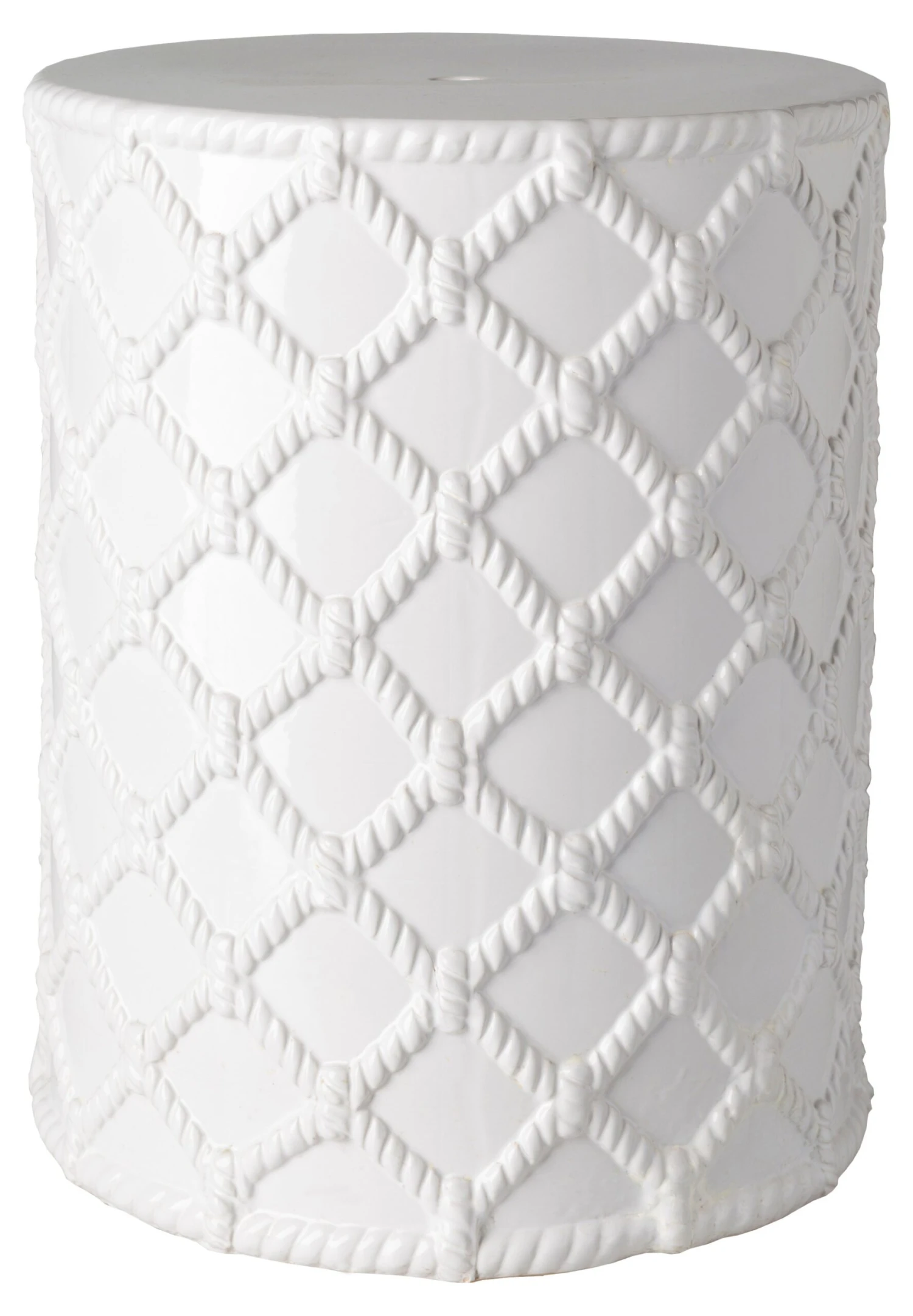 A stylish addition to the porch or patio, this ceramic garden stool is full of nautical appeal with its raised, rope-like design in white.
