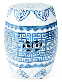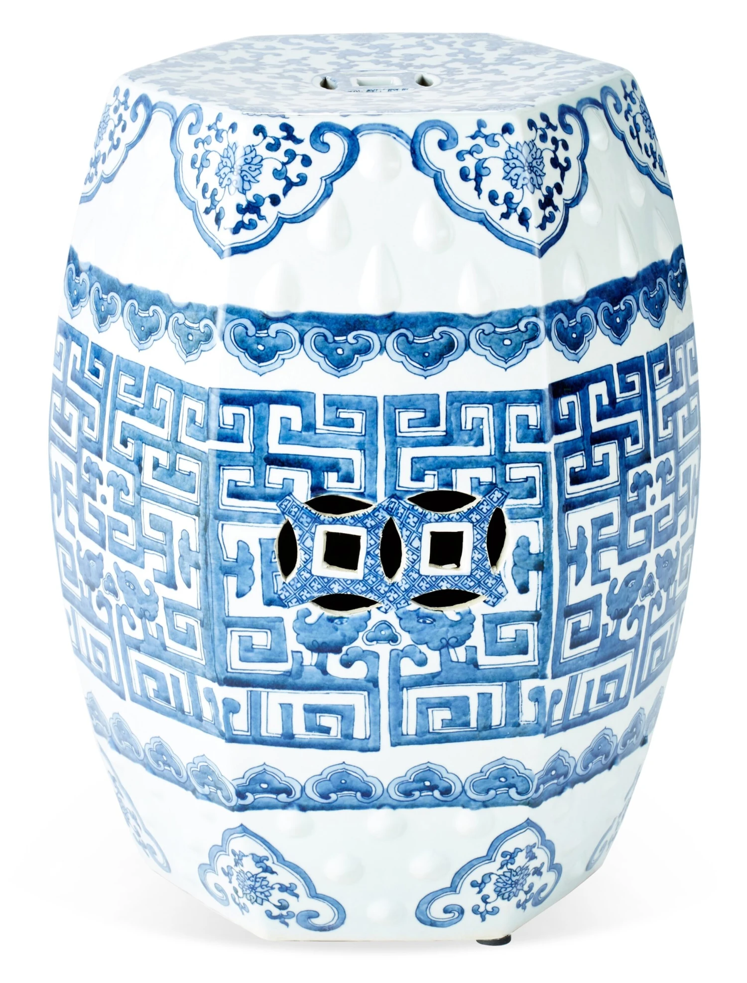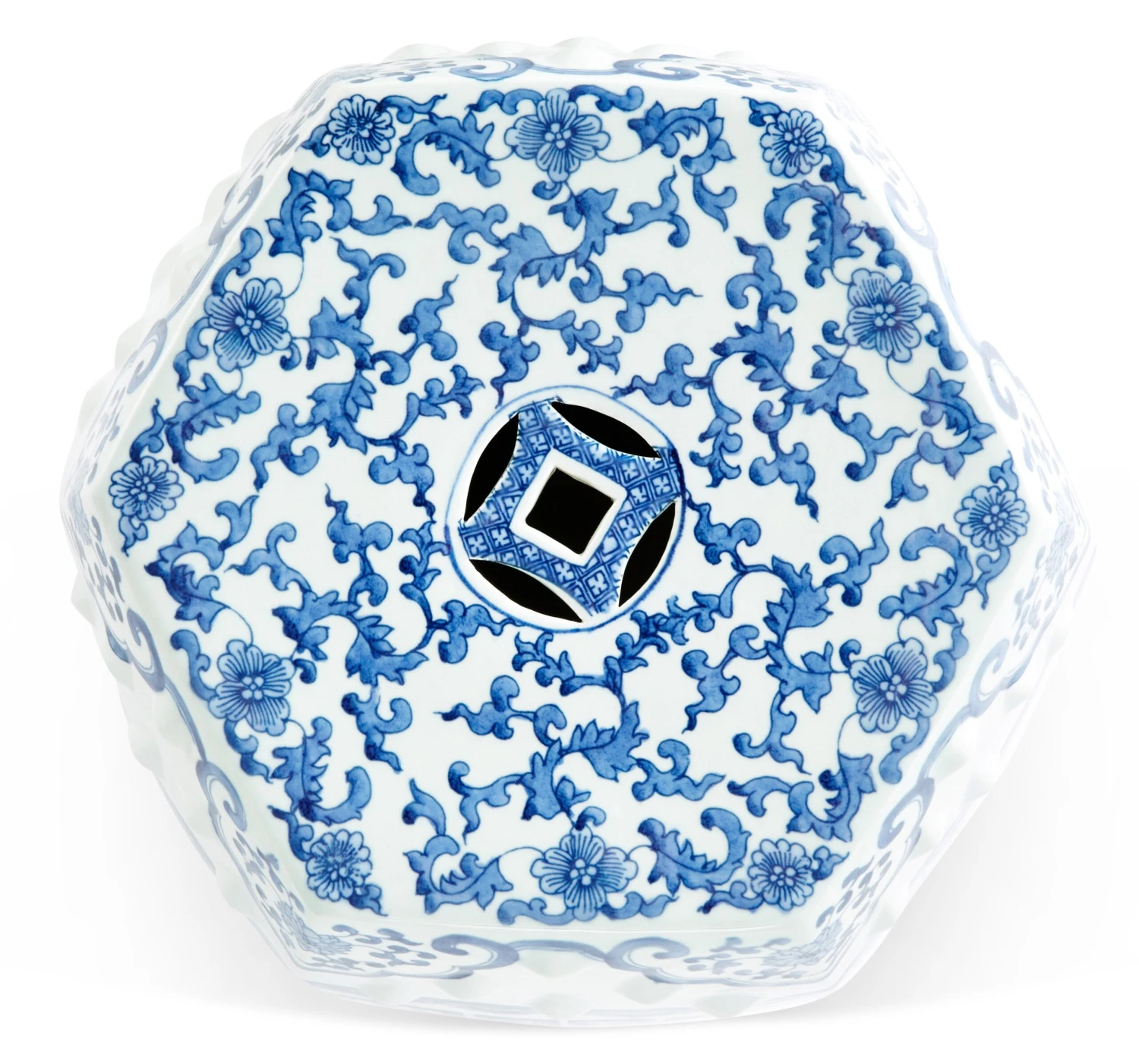 The hand-painted traditional patterns accentuate the classicism of this six-sided stool. Beautifully versatile, it can serve as an occasional table or extra seating.