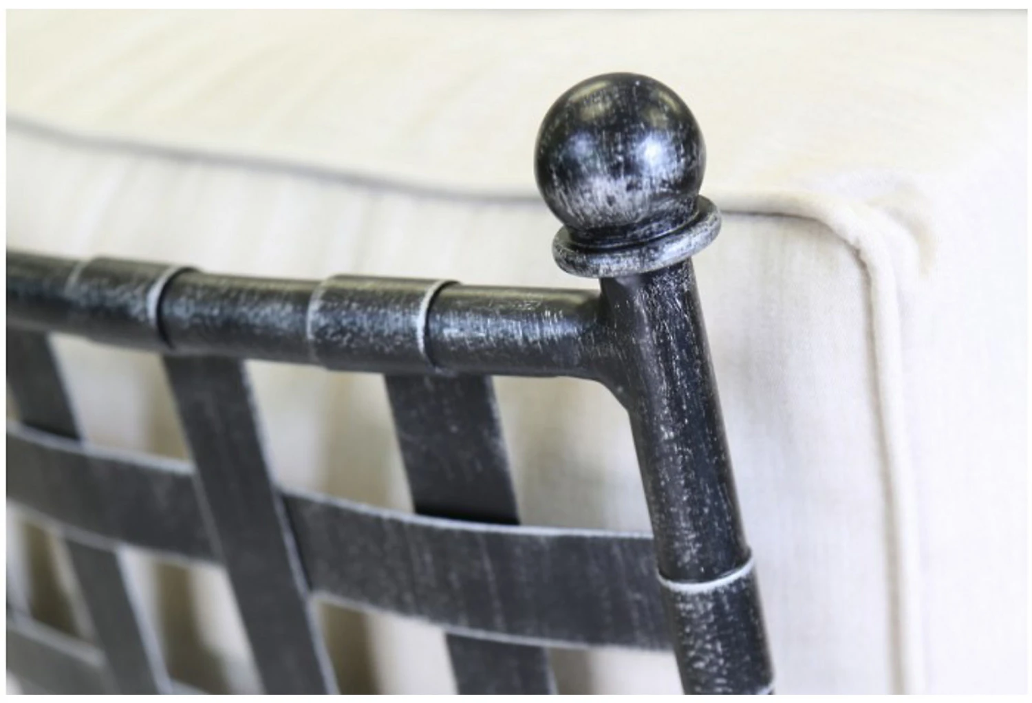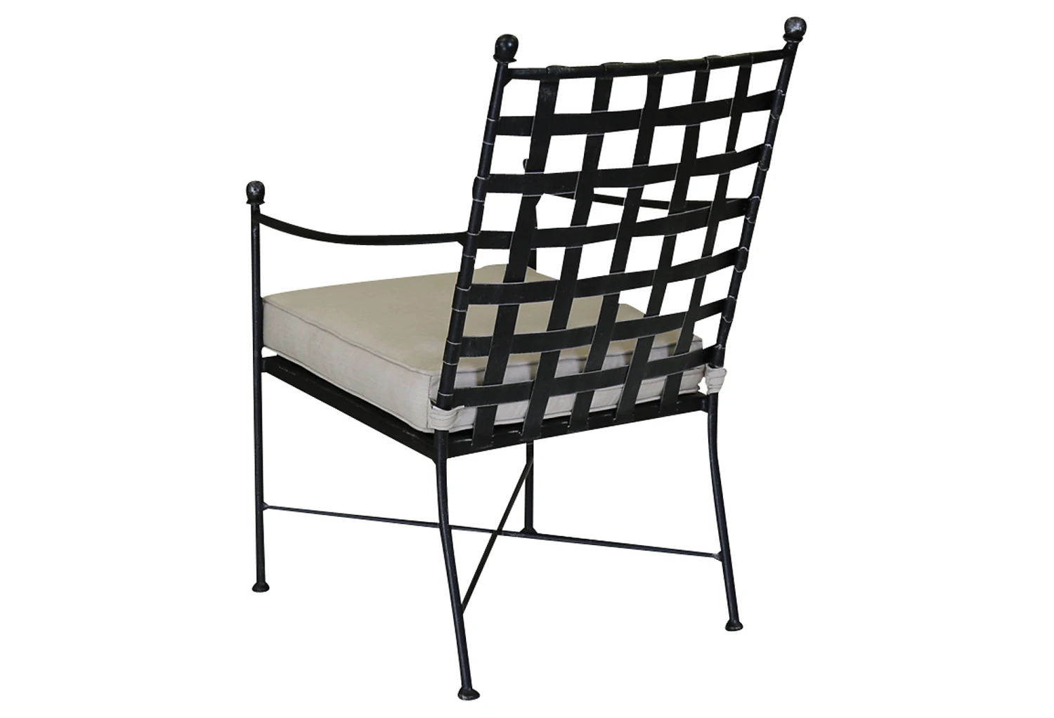 Crafted with a sturdy wrought iron frame and UV-and-moisture-resistant Sunbrella upholstery, this outdoor armchair is built to withstand the elements. Fashioned with a gridded seat back, X-shaped stretcher, and a distressed black finish.