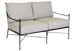 Crafted with a sturdy wrought iron frame and UV-and-moisture-resistant Sunbrella upholstery, this outdoor loveseat is built to withstand the elements. Fashioned with a gridded seat back, X-shaped stretcher, generous padding, and a distressed black finish.