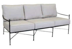 Crafted with a sturdy wrought iron frame and UV-and-moisture-resistant Sunbrella upholstery, this outdoor sofa is built to withstand the elements. Fashioned with a gridded seat back, X-shaped stretcher, generous padding, and a distressed black finish.