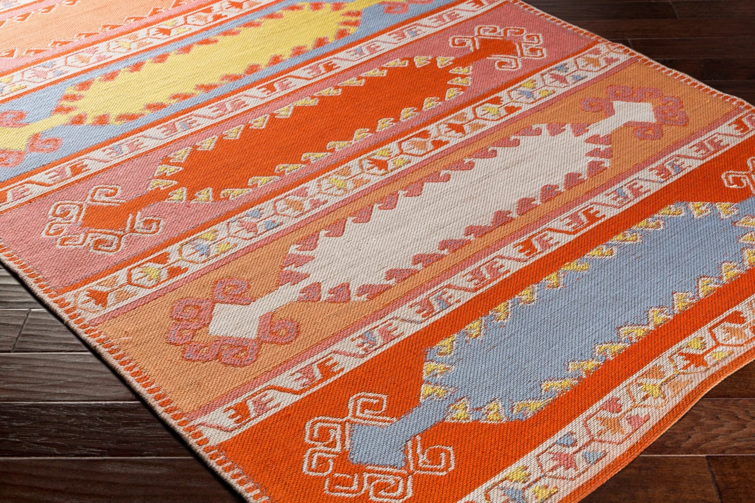 Style with staying power: This bold, bright outdoor rug is made of durable PET yarn, a material known to hold up to the elements and withstand wear and tear. Perfect for use on the patio, it can also be brought indoors to protect flooring in high-traffic areas. We recommend a rug pad to extend the life of the rug and keep it securely in place.