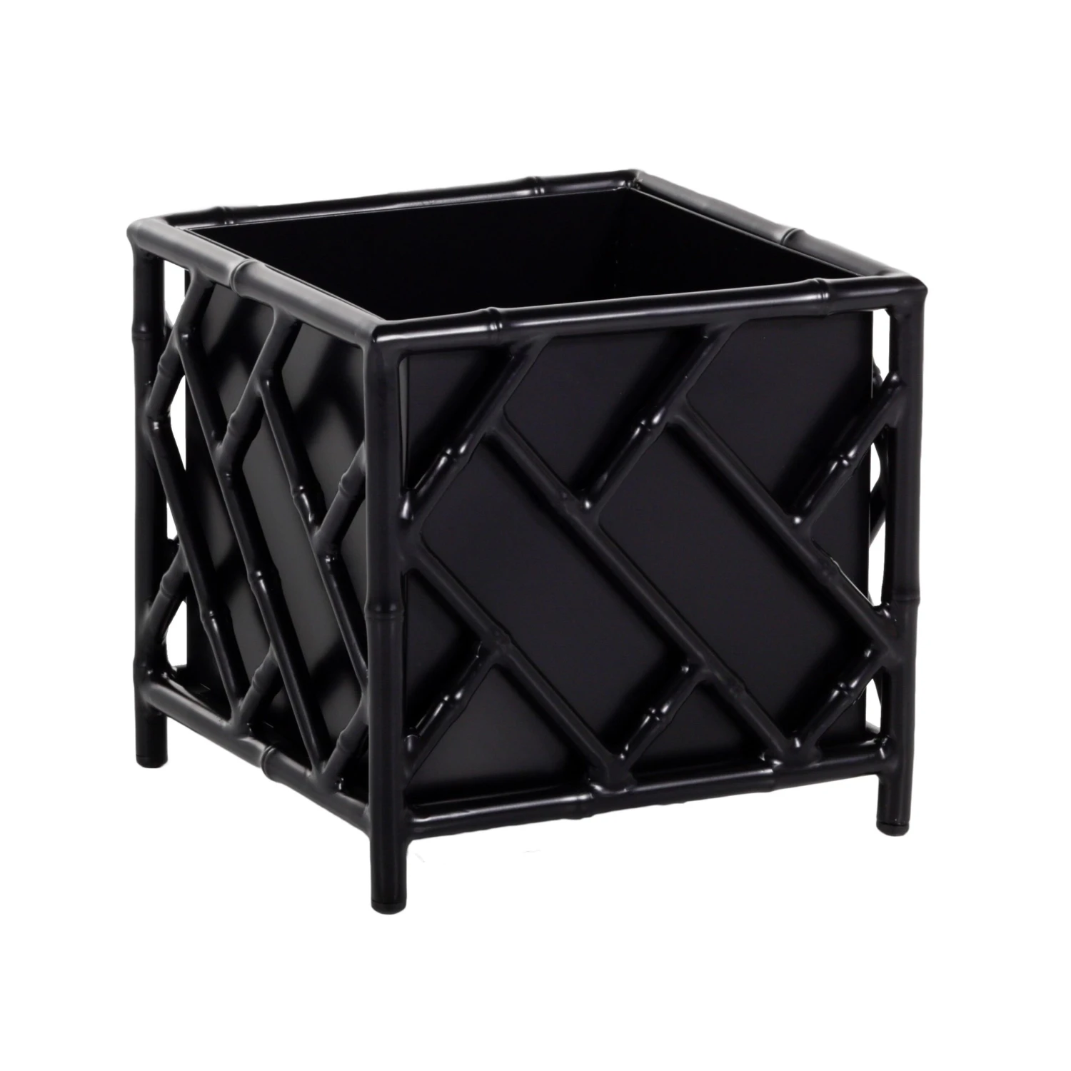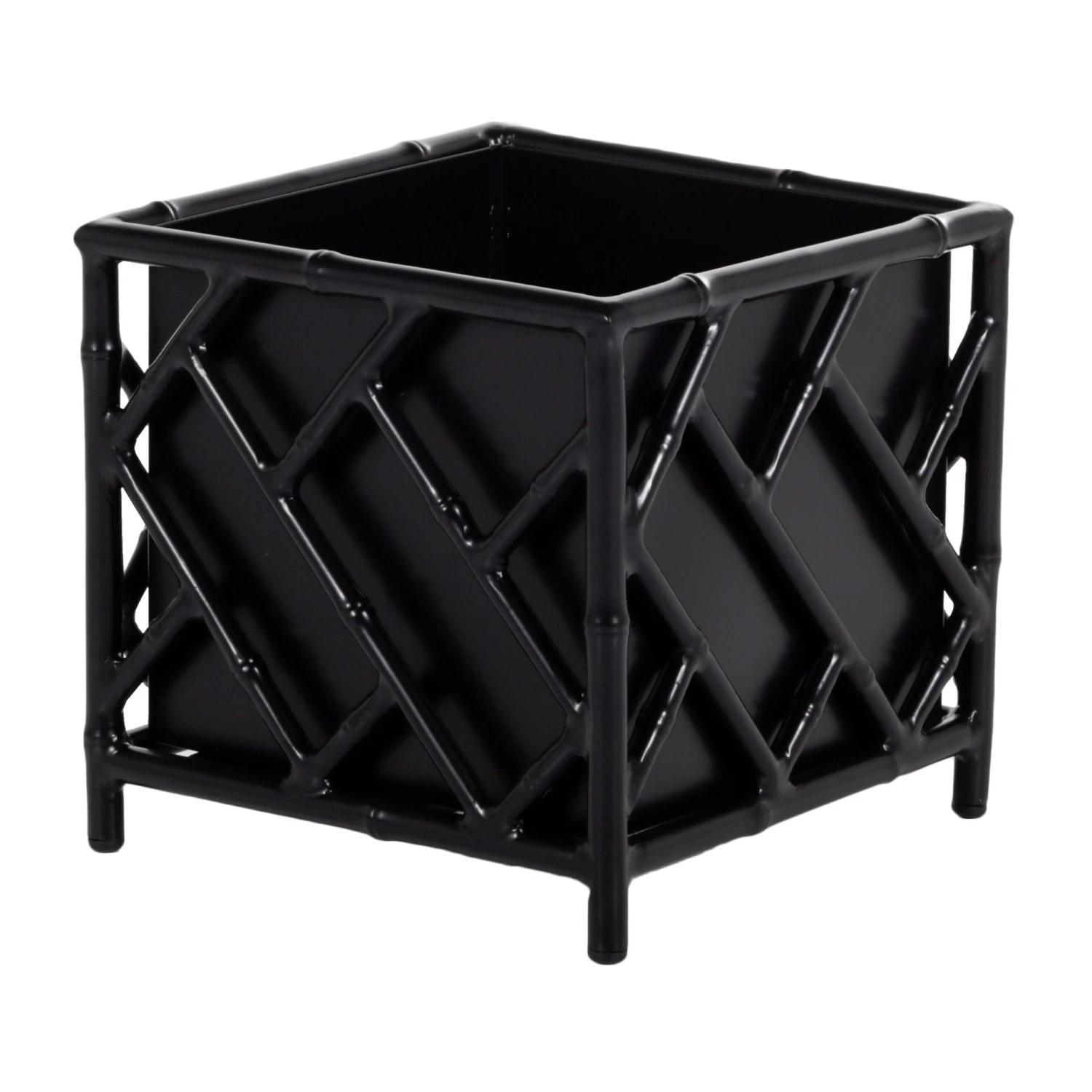 Designed in collaboration with Celerie Kemble exclusively for One Kings Lane: Offering a modern update on classic Chinese Chippendale designs, this outdoor planter is crafted of powder-coated aluminum with impressive fretwork and a black finish. Features removable insert and bottom flats for easy drainage. Available in both large and small size.