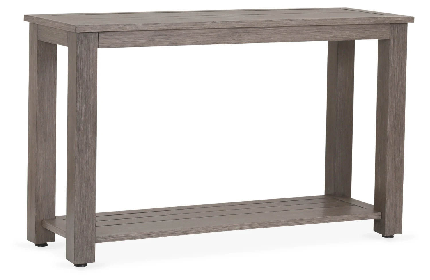 Built to endure the elements, this outdoor console table is crafted with a powder-coated aluminum frame in a rich driftwood finish.