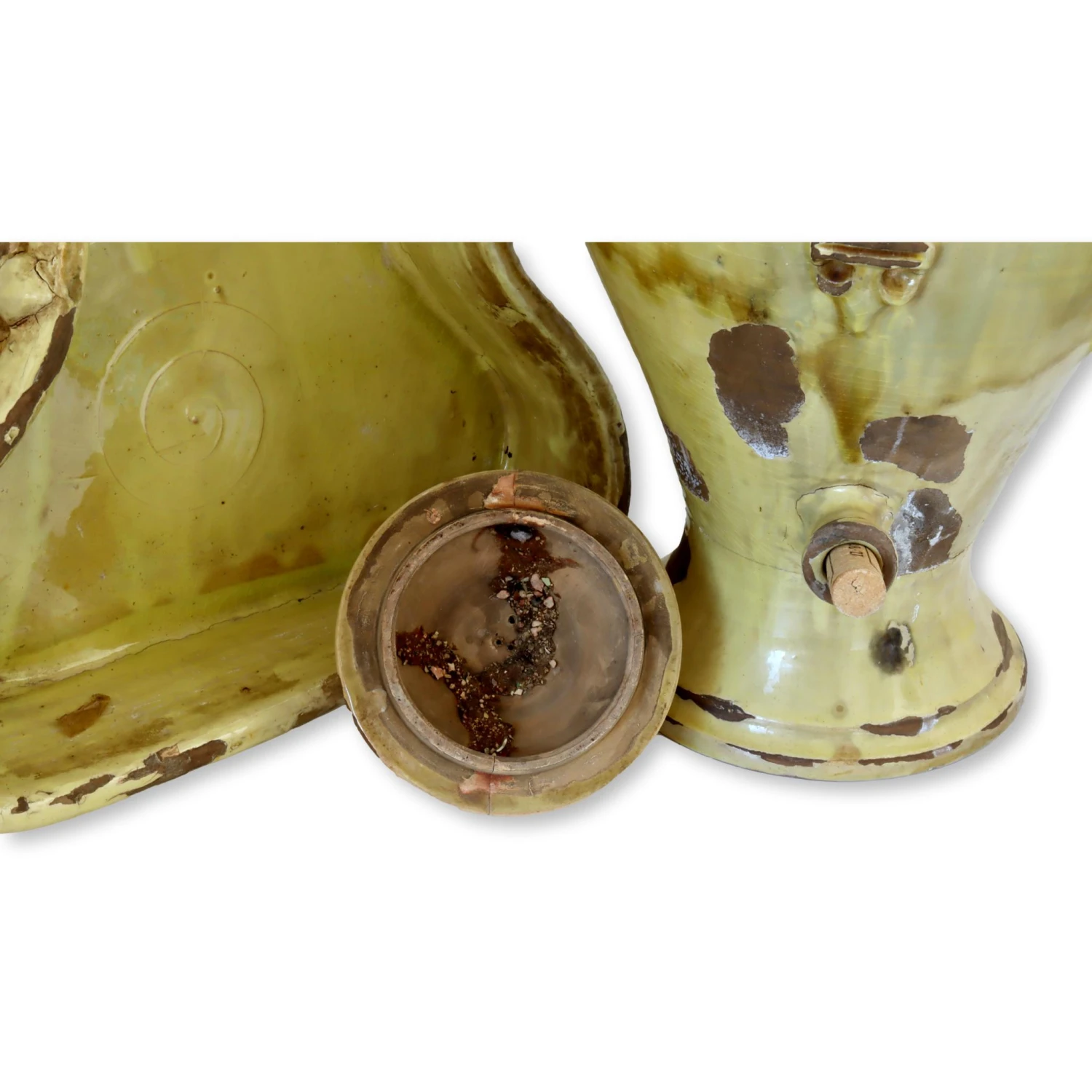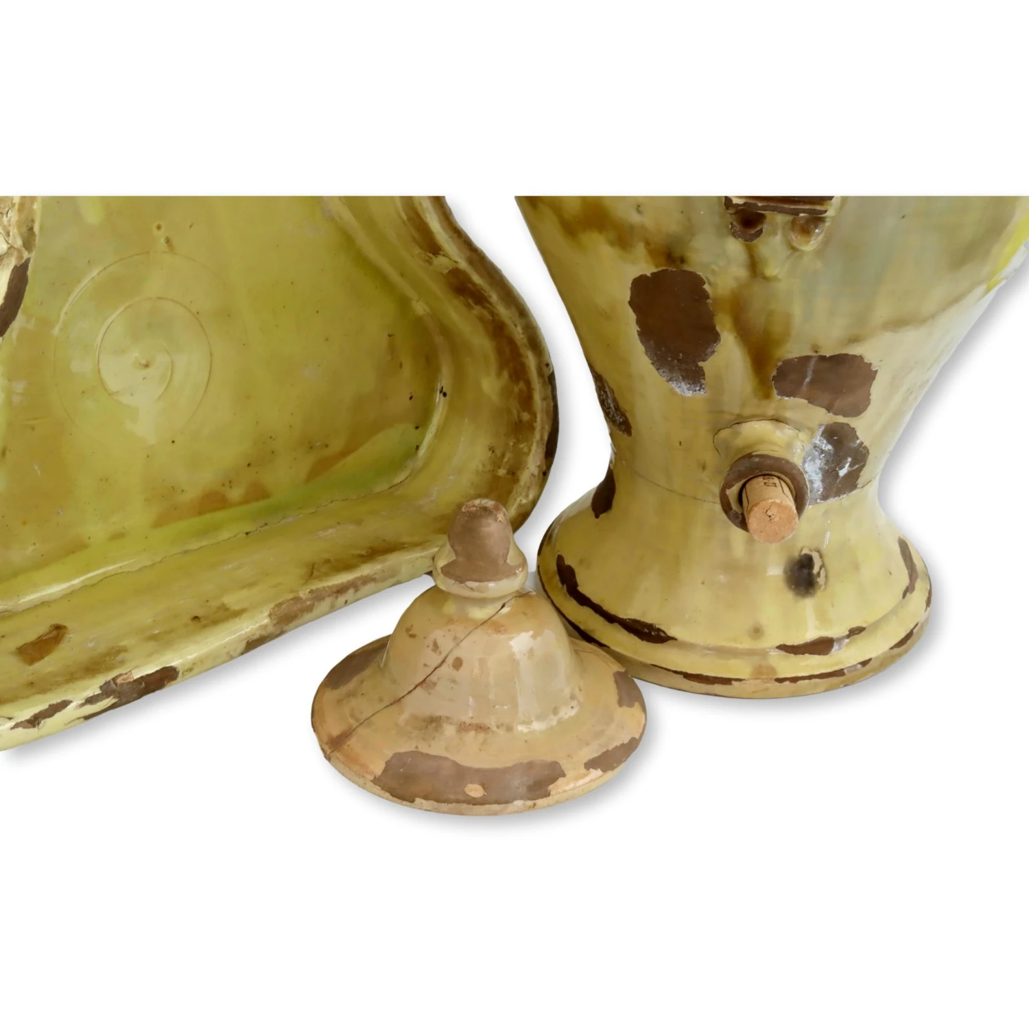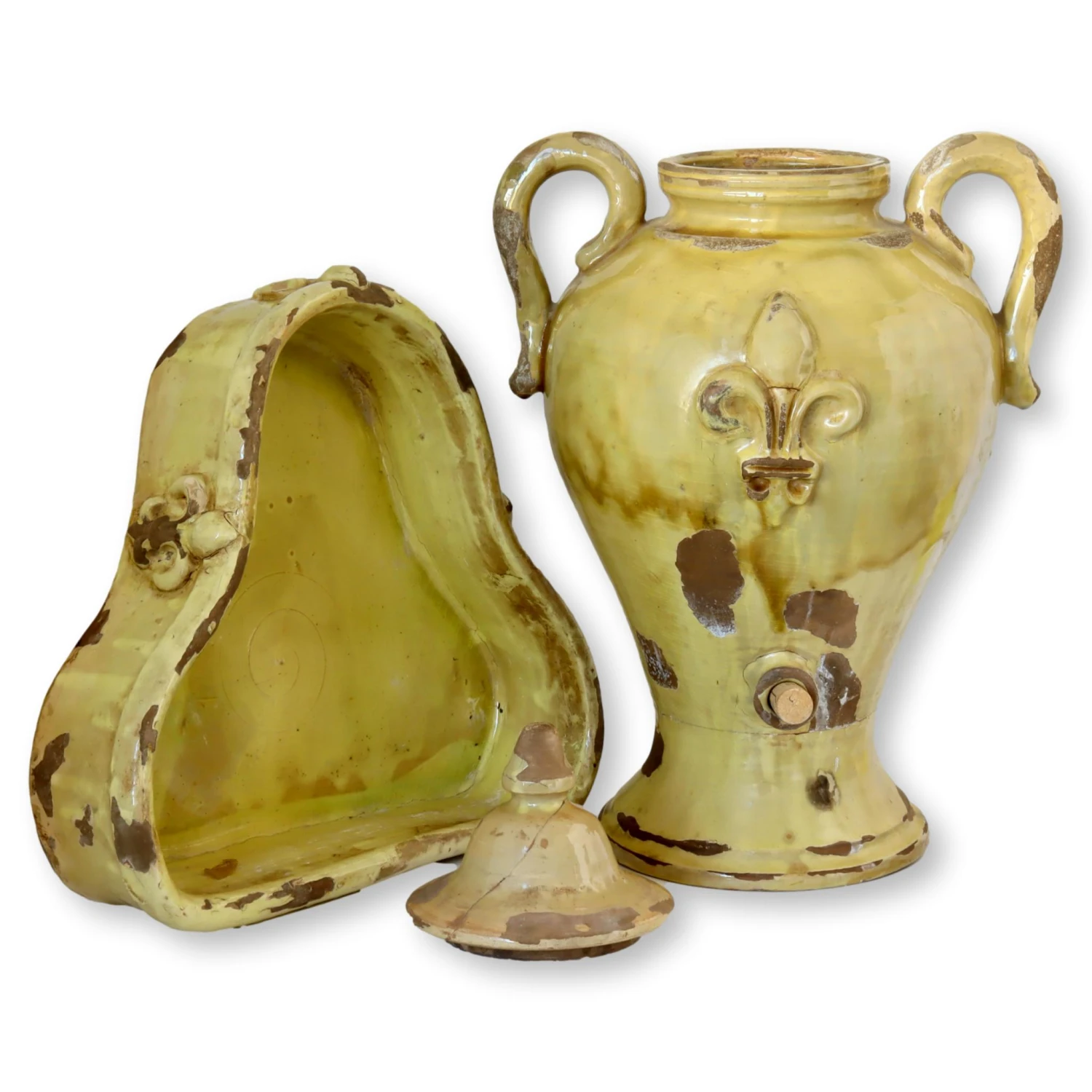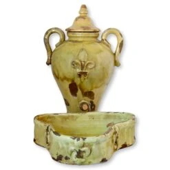 Very large French lavabo and bowl with fleur-de-lis accents. The vessel is free-standing, not to be hung. It sits within the bowl, although they could be used as two separate accent pieces if desired. Spout is long since gone, but could be easily replaced and calked into place if desired. Lid has rustic repair, see photos. Very heavy piece made during the 19th century, weighs nearly 40 lbs. Dimensions: urn, 14.5″L x 13″W x 22″H; bowl, 16.5″L x15″W x 4″H. No maker’s mark.