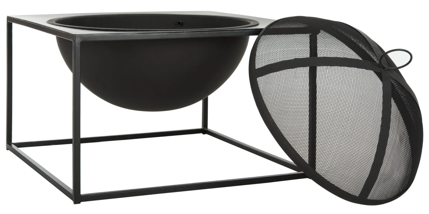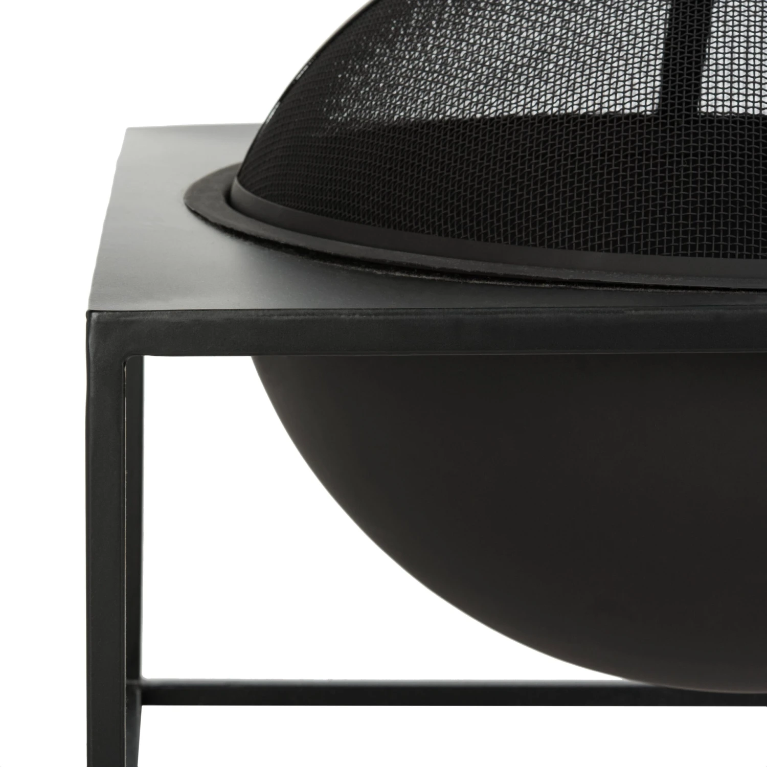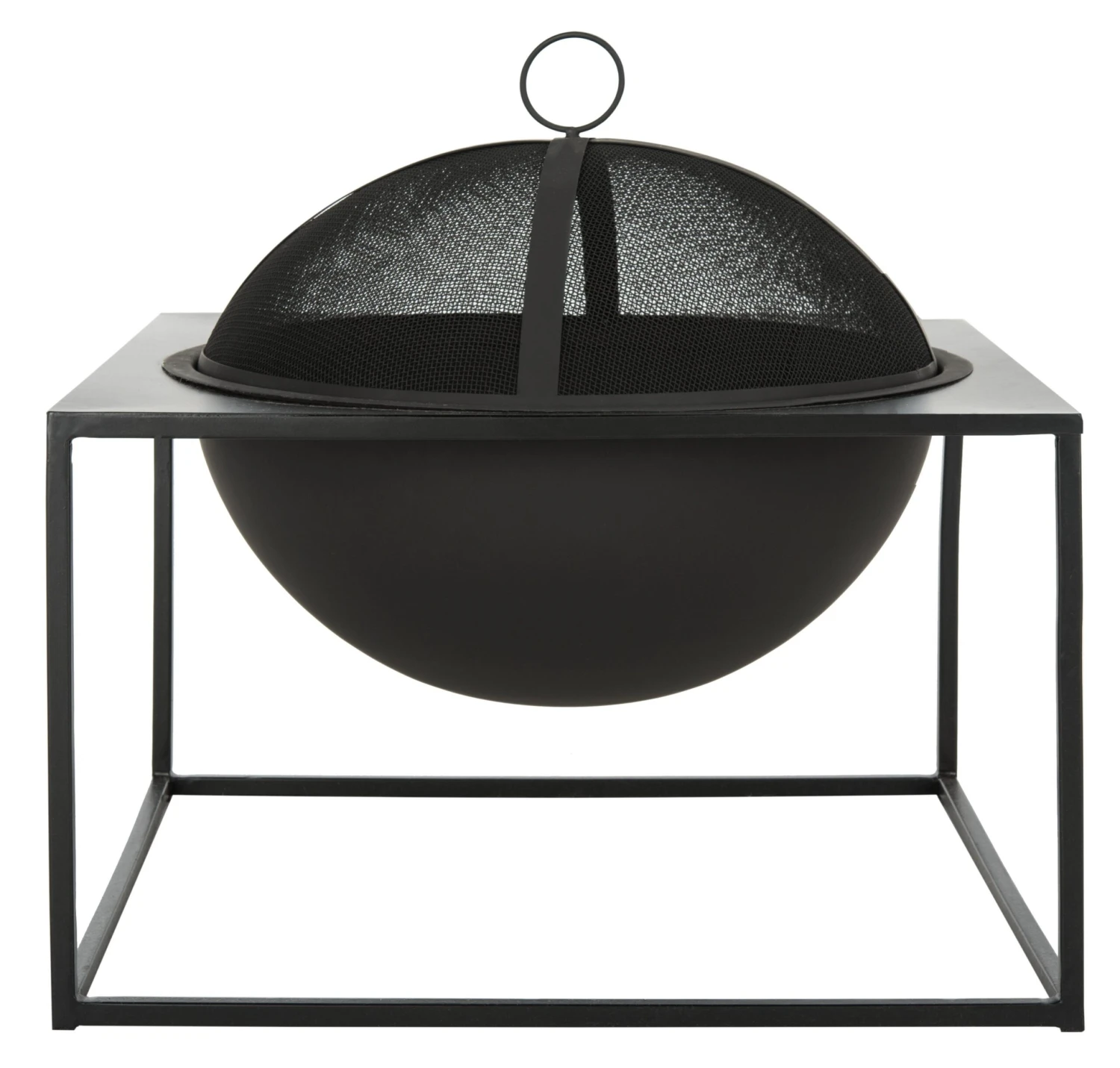 Perfect for enjoying cool nights outdoors, this wood-burning fire pit is crafted of black iron with an open, geometric base and removable protective screen top.