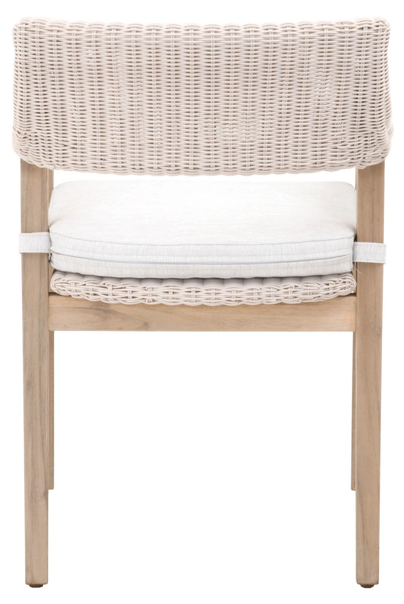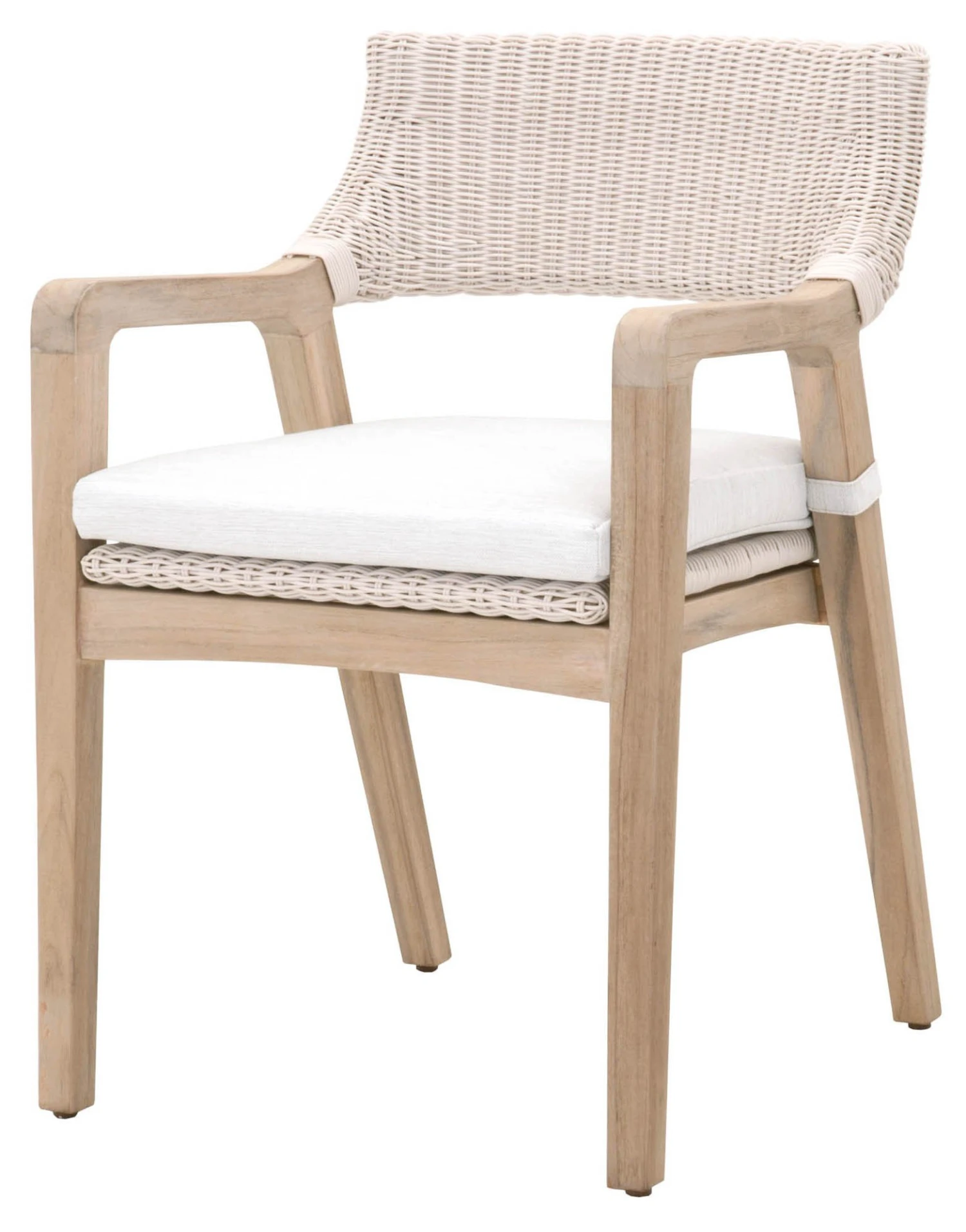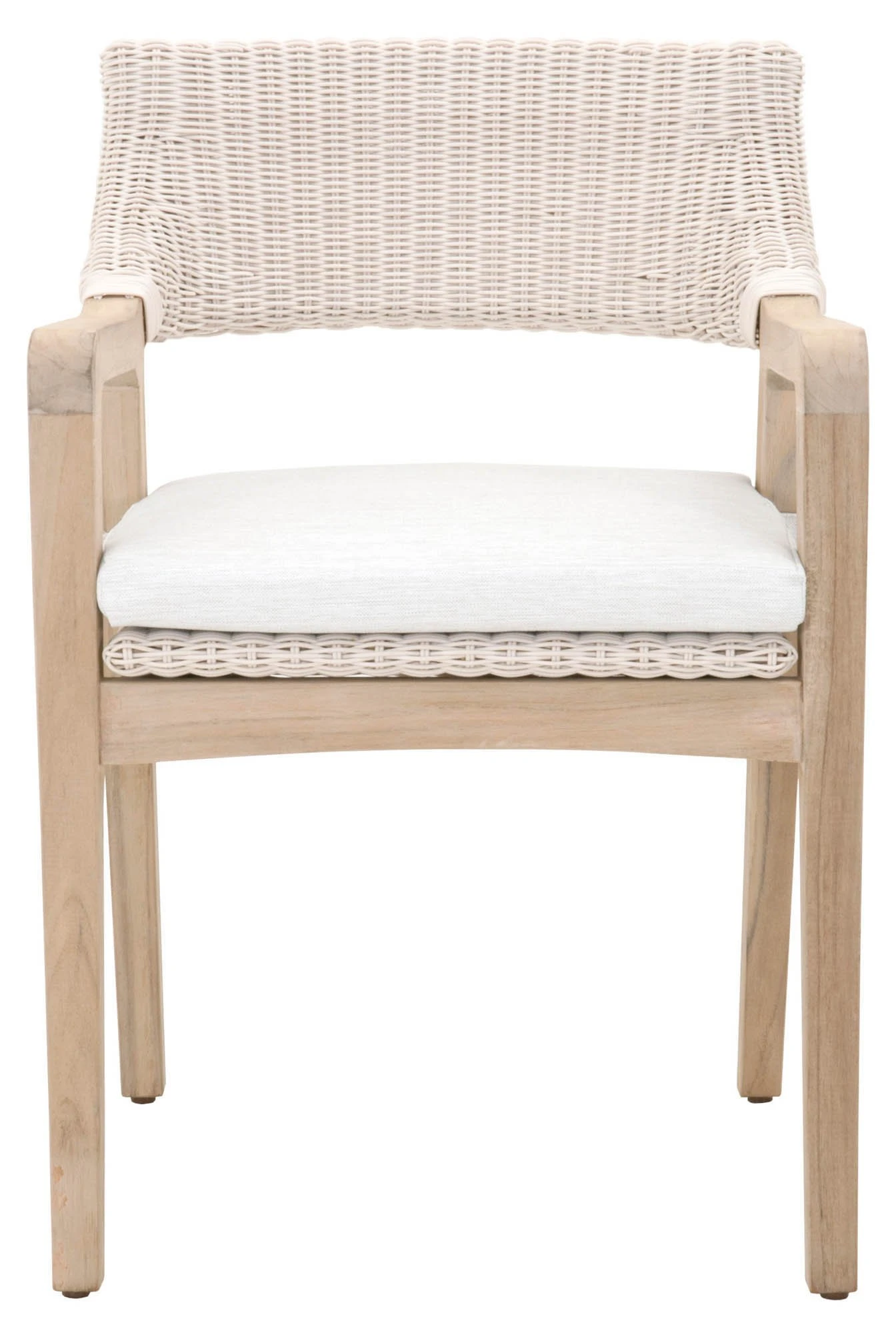 Framed in teak with a synthetic wicker seat and back, this textural armchair is sure to stand out on the porch or patio. An all-weather cushion filled with foam ensures a comfortable seat. Suitable for use outdoors and indoors.
