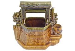 Vintage McCoy wishing well ceramic cachepot with bud vase size smaller side well bucket. Steel chain and ring handle for the bucket. Phrase on the well stays: “Grant A Wish To He” on one side and “Oh Wishing Well” on the other. Marked “McCoy, USA” on the underside.