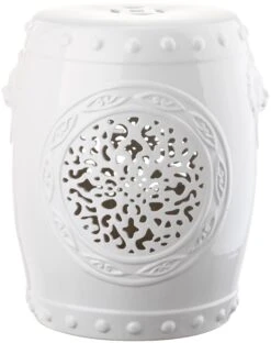 This ornate ceramic garden stool features a pierced medallion, embossed Chinese vessel nailheads, and a glossy white finish. Stylish and versatile, it can be used as a plant stand, stool, or side table.