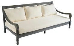 This six-feet-wide daybed recalls the casual elegance of a bygone era with its generous proportions and classic British styling. It is crafted of durable, eco-friendly acacia in a handsome gray finish and topped with plush all-weather beige cushions.