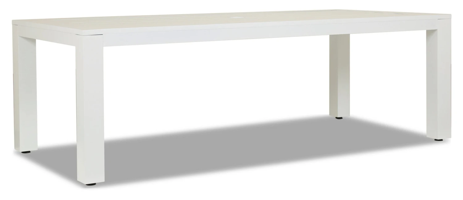 This dining table makes a stylish addition to your favorite outdoor space. Its clean-lined frame is crafted of all-weather aluminum with a slatted top and satin white finish. Seats up to eight guests.