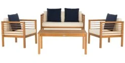 Inspired by a breezy Barcelona resort, this outdoor lounge set includes a loveseat, coffee table, and two armchairs crafted of eucalyptus with white weatherproof upholstery amply padded in foam. Four navy throw pillows add a fun pop of contrast.
