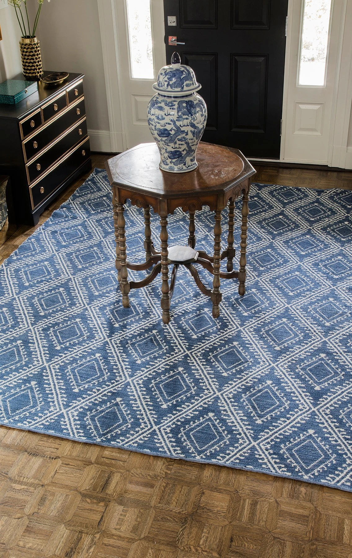 This graphic outdoor rug is made of durable polypropylene, an easy-to-clean material that can withstand the elements and resists wear and tear. Perfect for use on the porch or patio, it can also be brought indoors to protect flooring in high-traffic areas. We recommend a rug pad to extend the life of your rug and keep it securely in place.