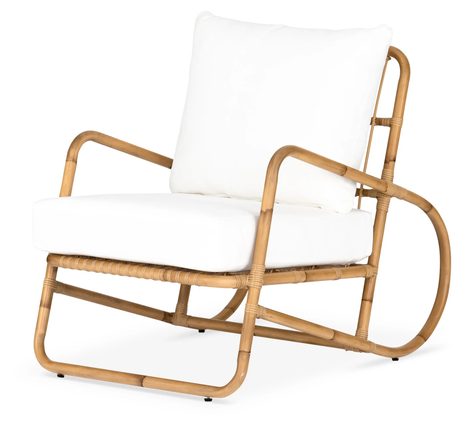 Though the frame of this armchair appears to be made of rattan and rope, it’s actually crafted of weather-resistant aluminum and synthetic wicker. The amply filled cushions, covered in colorfast, mildew-resistant fabric, ensure optimal comfort.