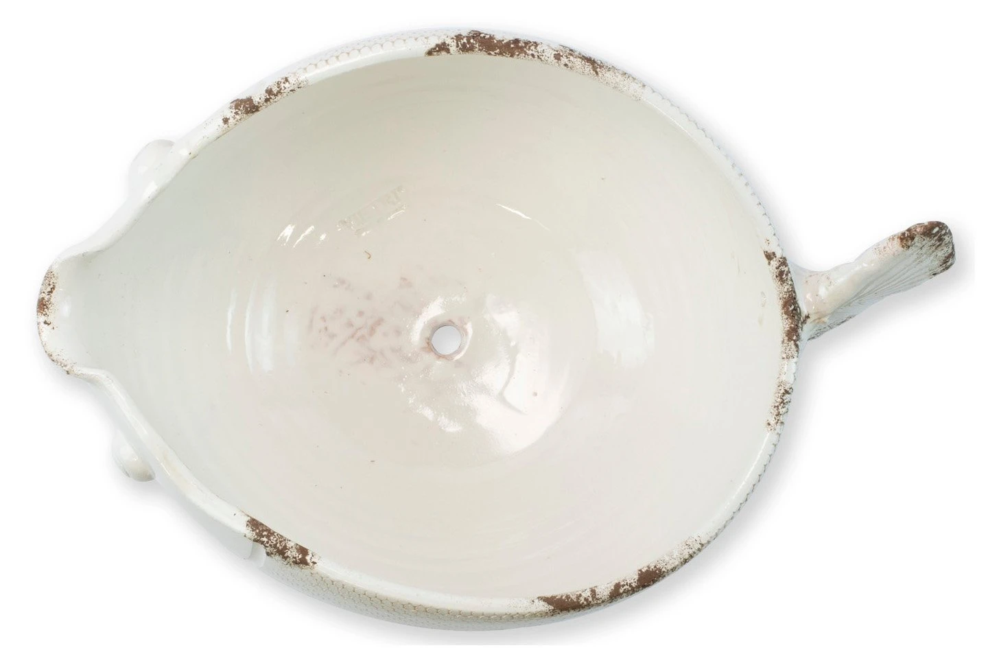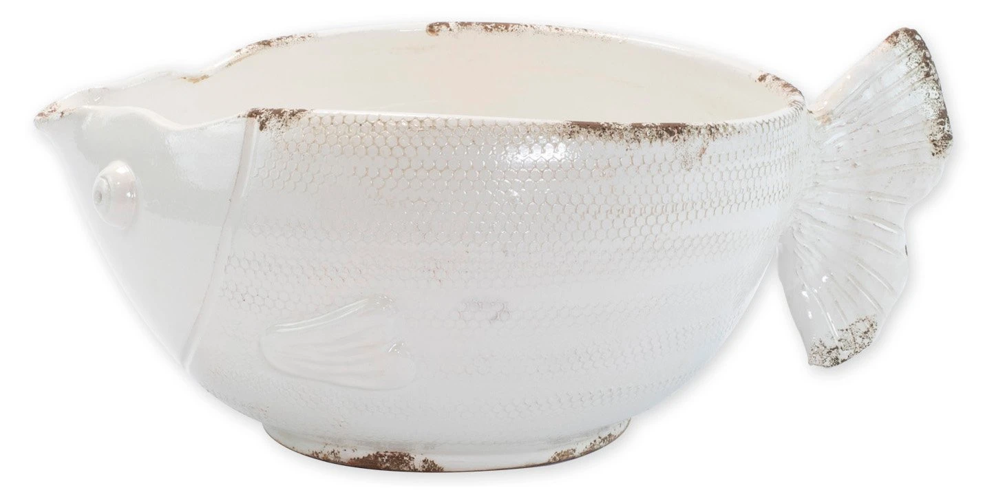 Hand-sculpted in Tuscany, this fish-shape planter boasts impressive detail. The distressed finish gives it the gravitas of an antique find. A hole in the bottom allows for soil drainage. Suitable for indoor and outdoor use.