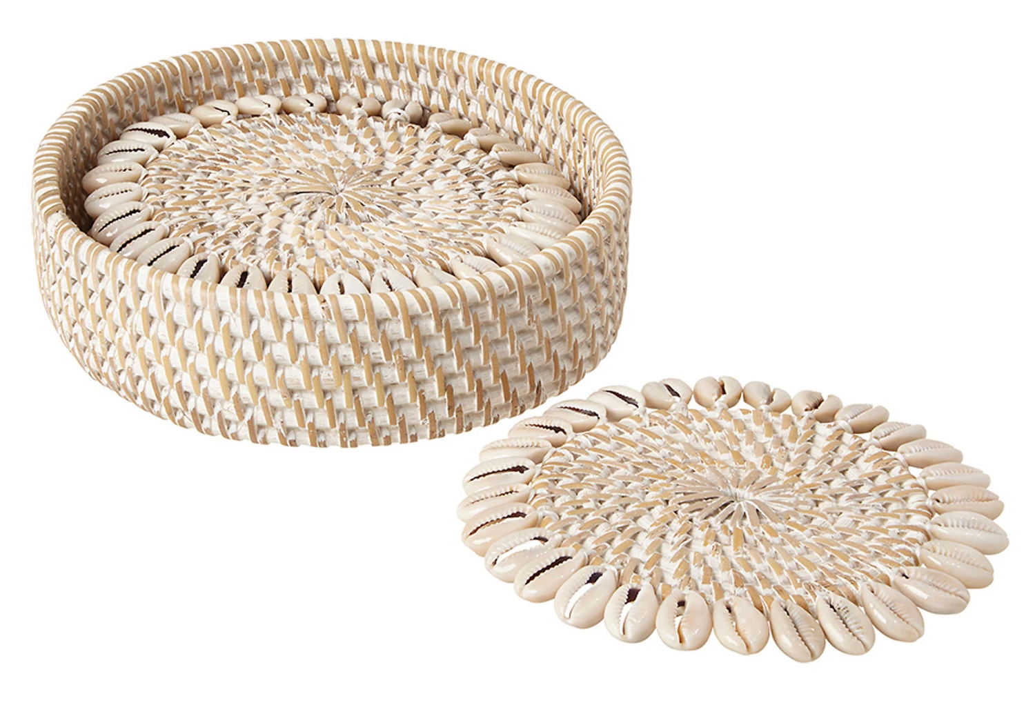 Beautifully woven of rattan with a puka-shell trim, these hearty coasters come housed in a matching case.