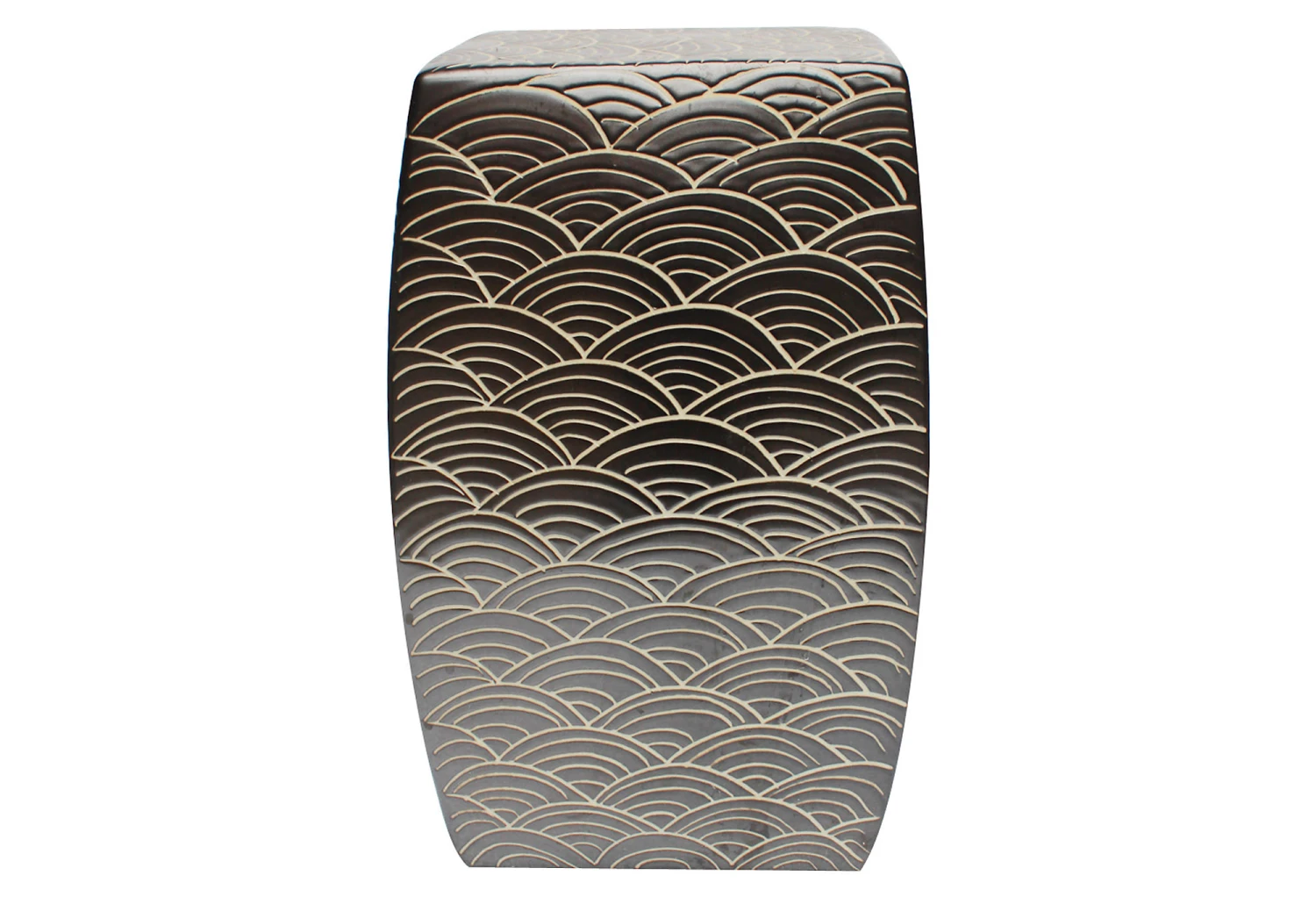 Crafted of high-fired porcelain for exceptional durability, this versatile garden stool features a dynamic allover pattern in black and white. Suitable for indoor and outdoor use.
