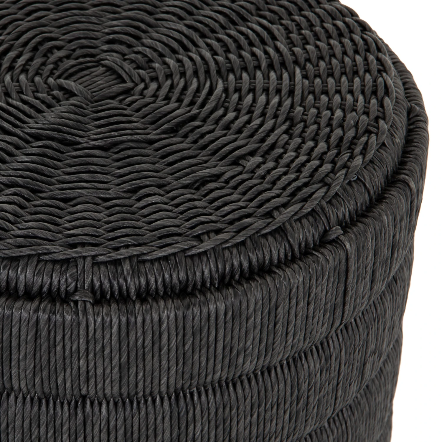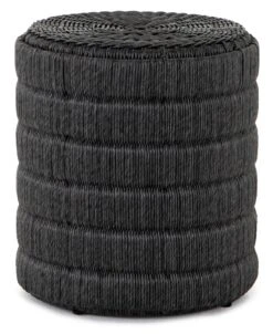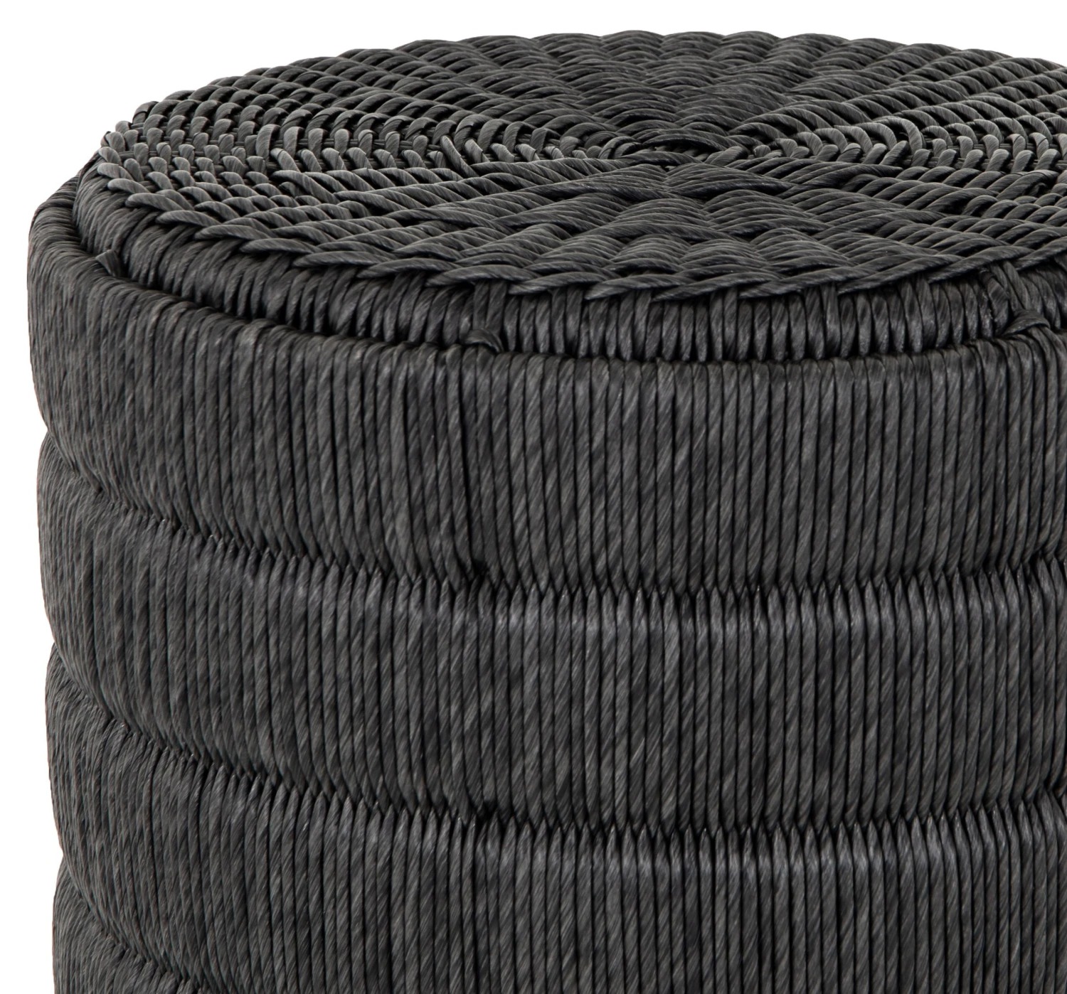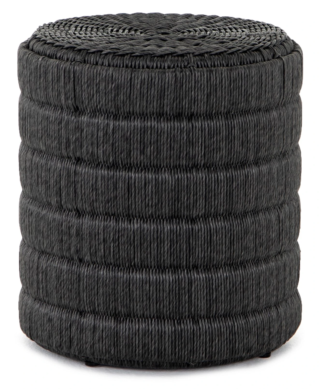 Finished in a deep coal, all-weather wicker beautifully rounds to form a texture-driven end table.