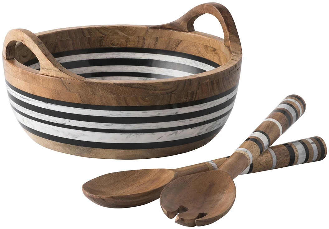 These serving utensils are shaped by hand of acacia wood with hand-marbled resin stripes that add eye-catching contrast.
