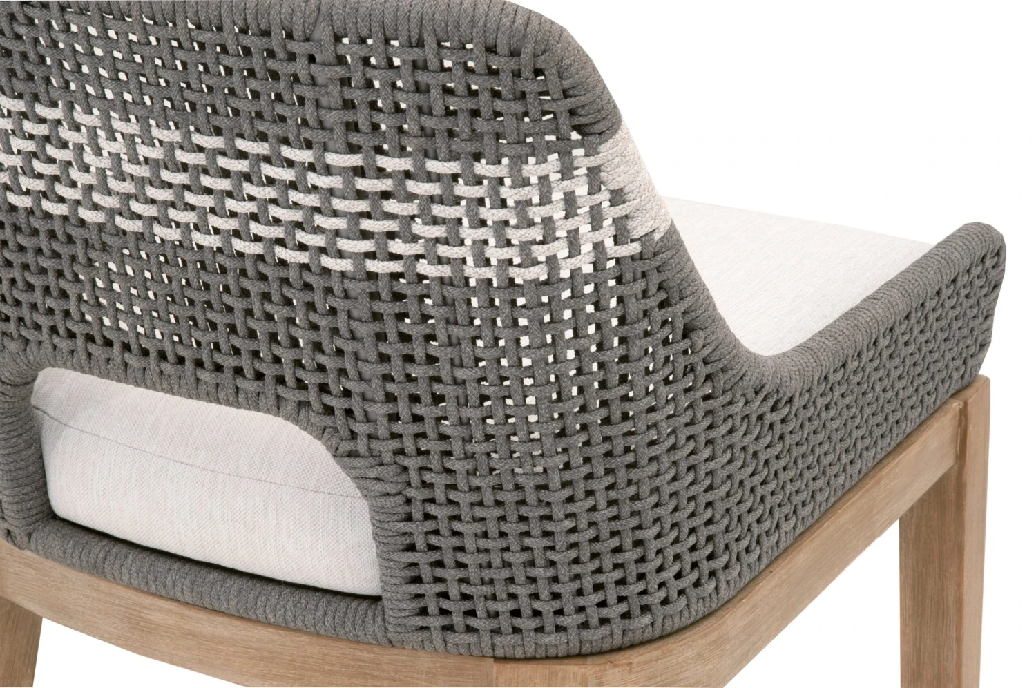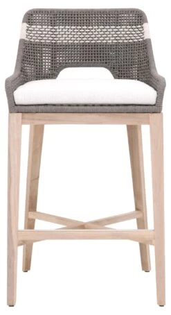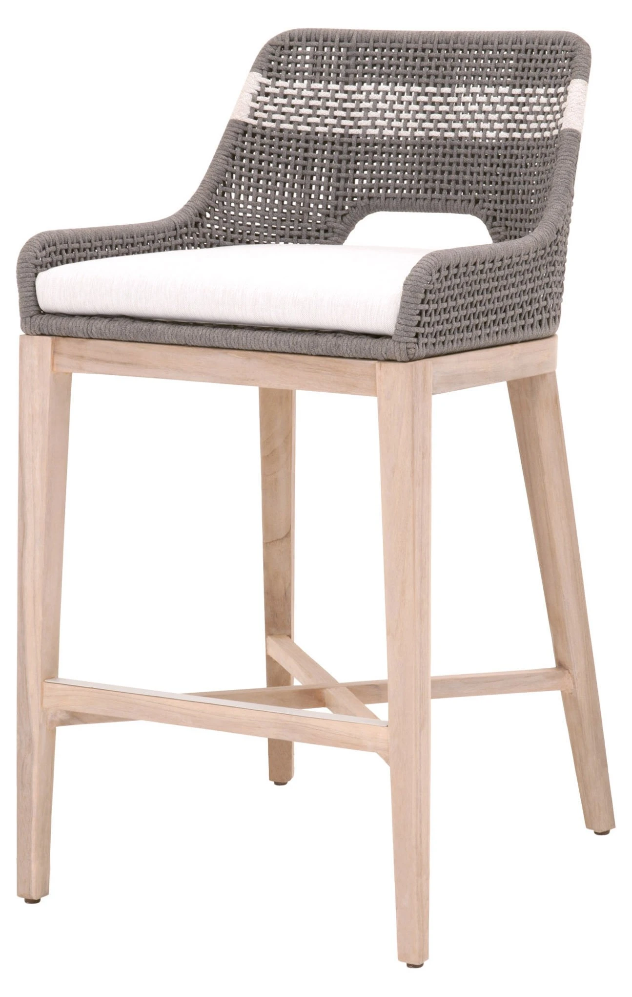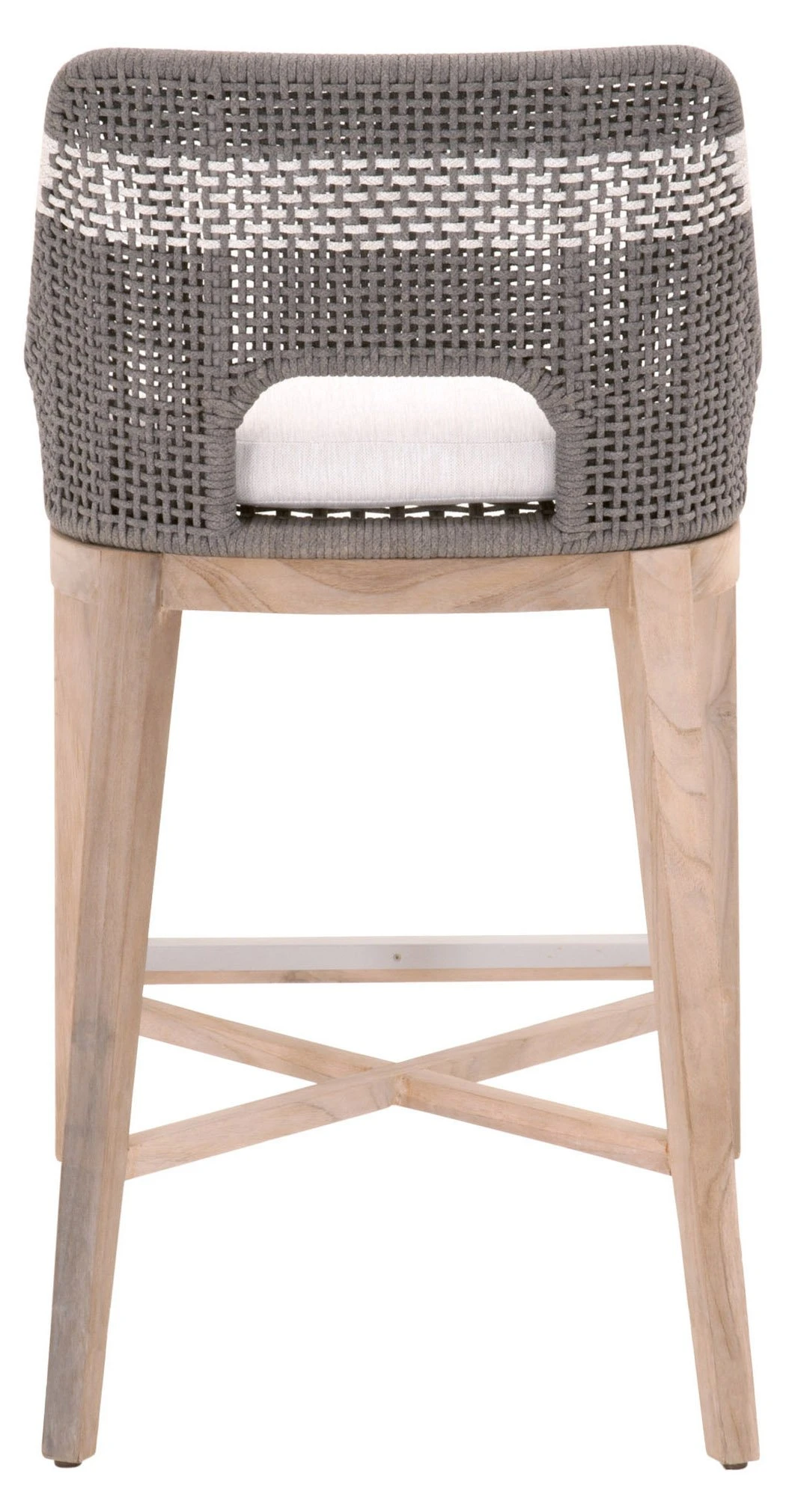 Framed in aluminum and teak—a moisture-resistant hardwood that is also resistant to warping, swelling, and shrinking—with intricately woven rope details, this textural barstool is sure to stand out on the porch or patio. An all-weather cushion filled with foam ensures a comfortable seat.