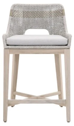 Framed in aluminum and teak—a moisture-resistant hardwood that is also resistant to warping, swelling, and shrinking—with intricately woven rope details, this textural counter stool is sure to stand out on the porch or patio. An all-weather cushion filled with foam ensures a comfortable seat.