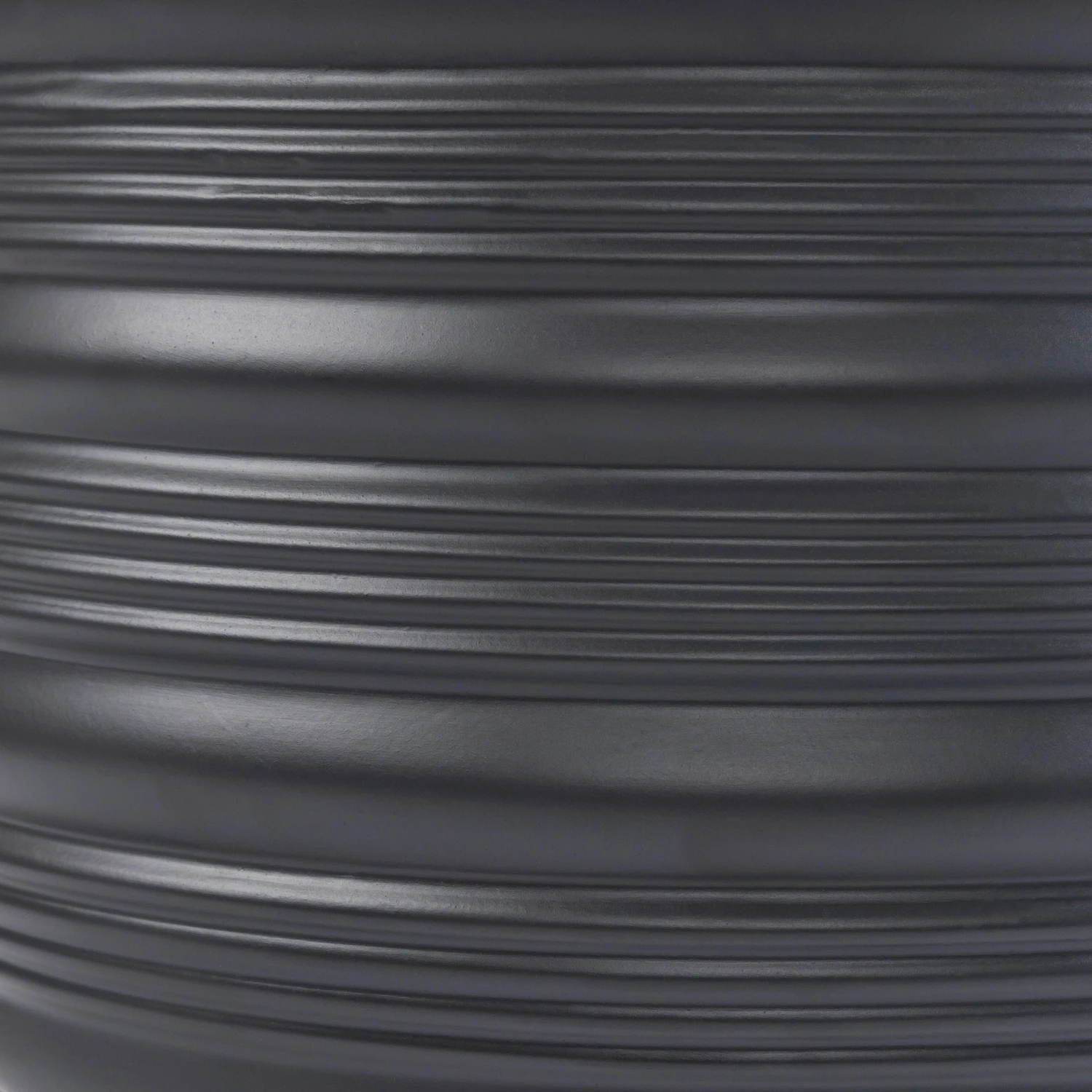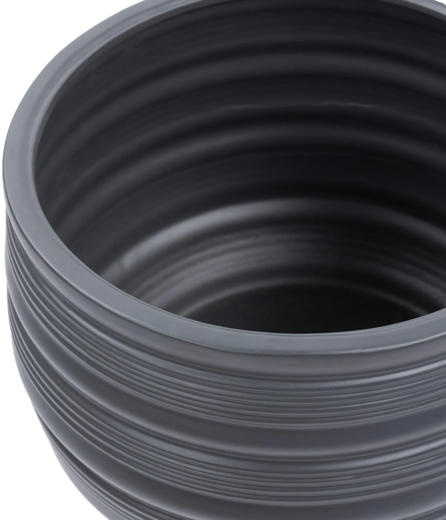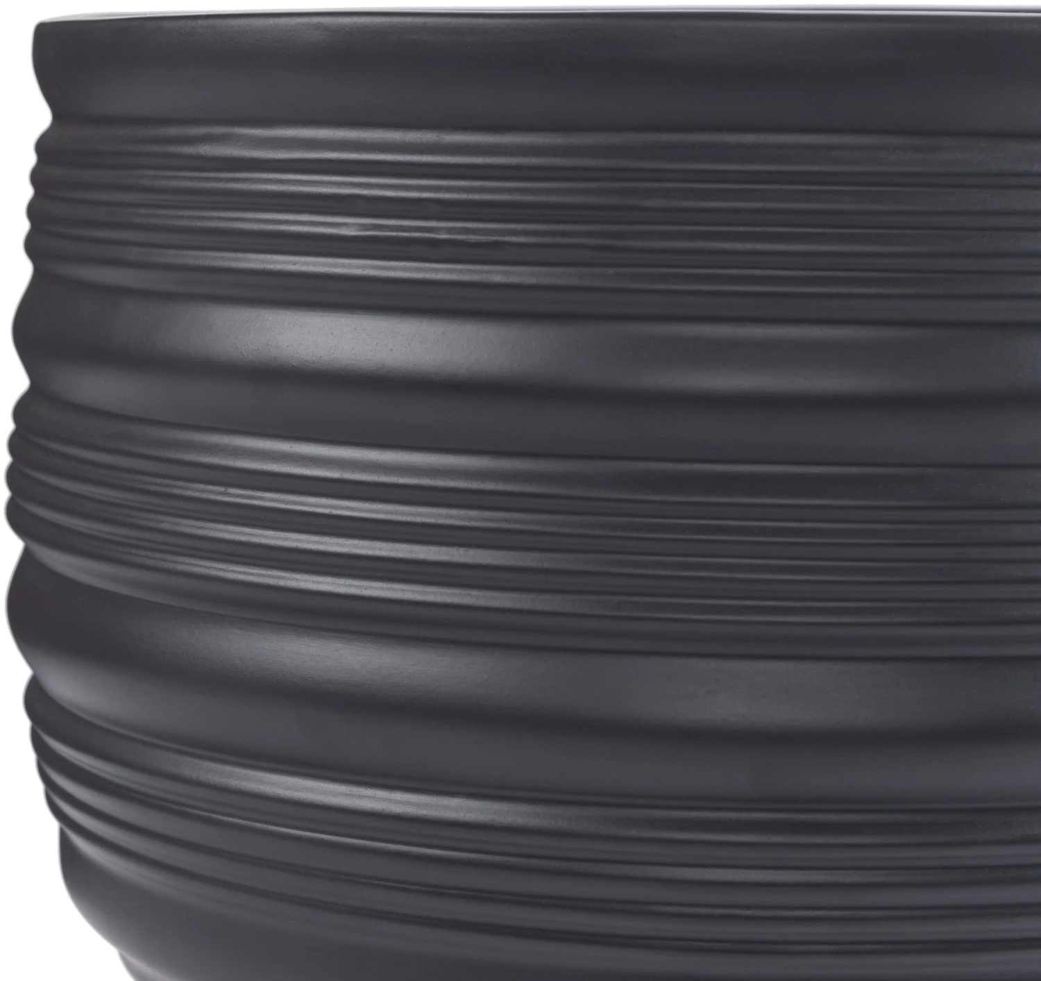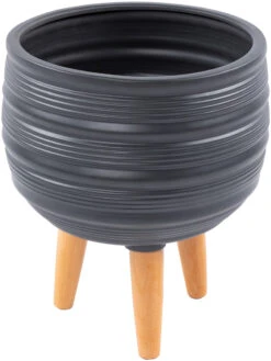 In an inviting juxtaposition of textures and shapes, splayed wood legs support a round ceramic planter with artisanal ribbing.