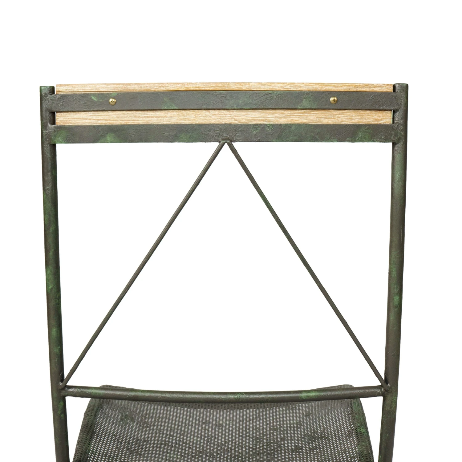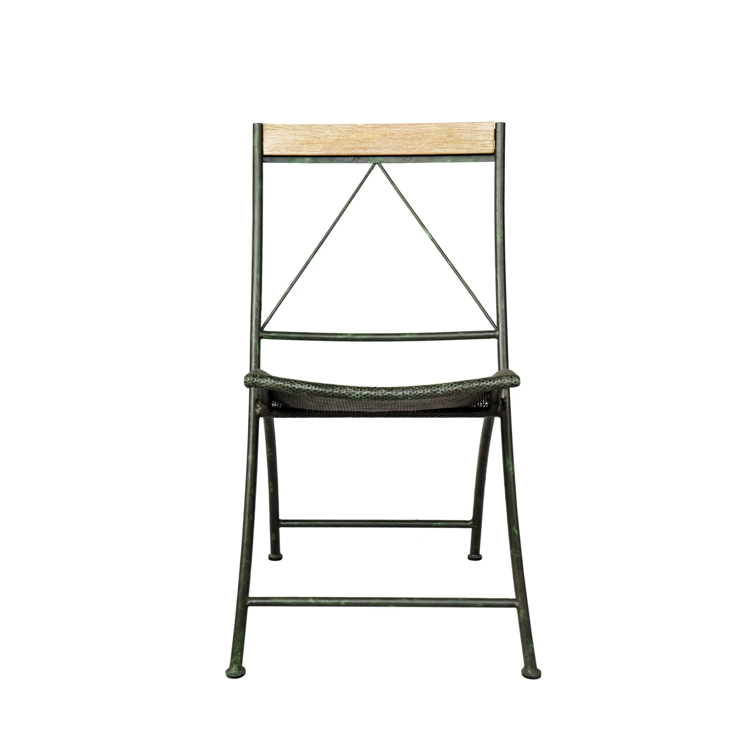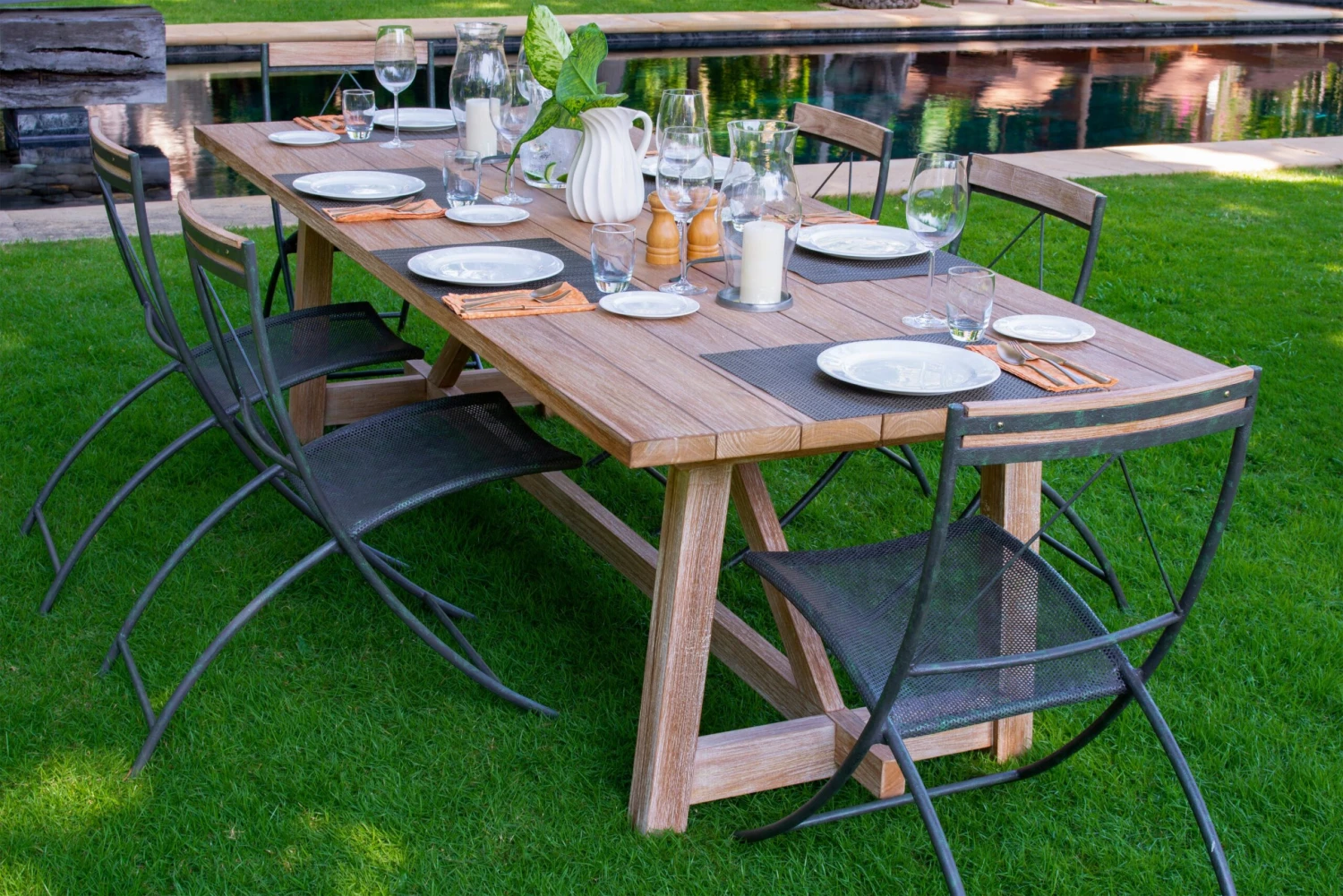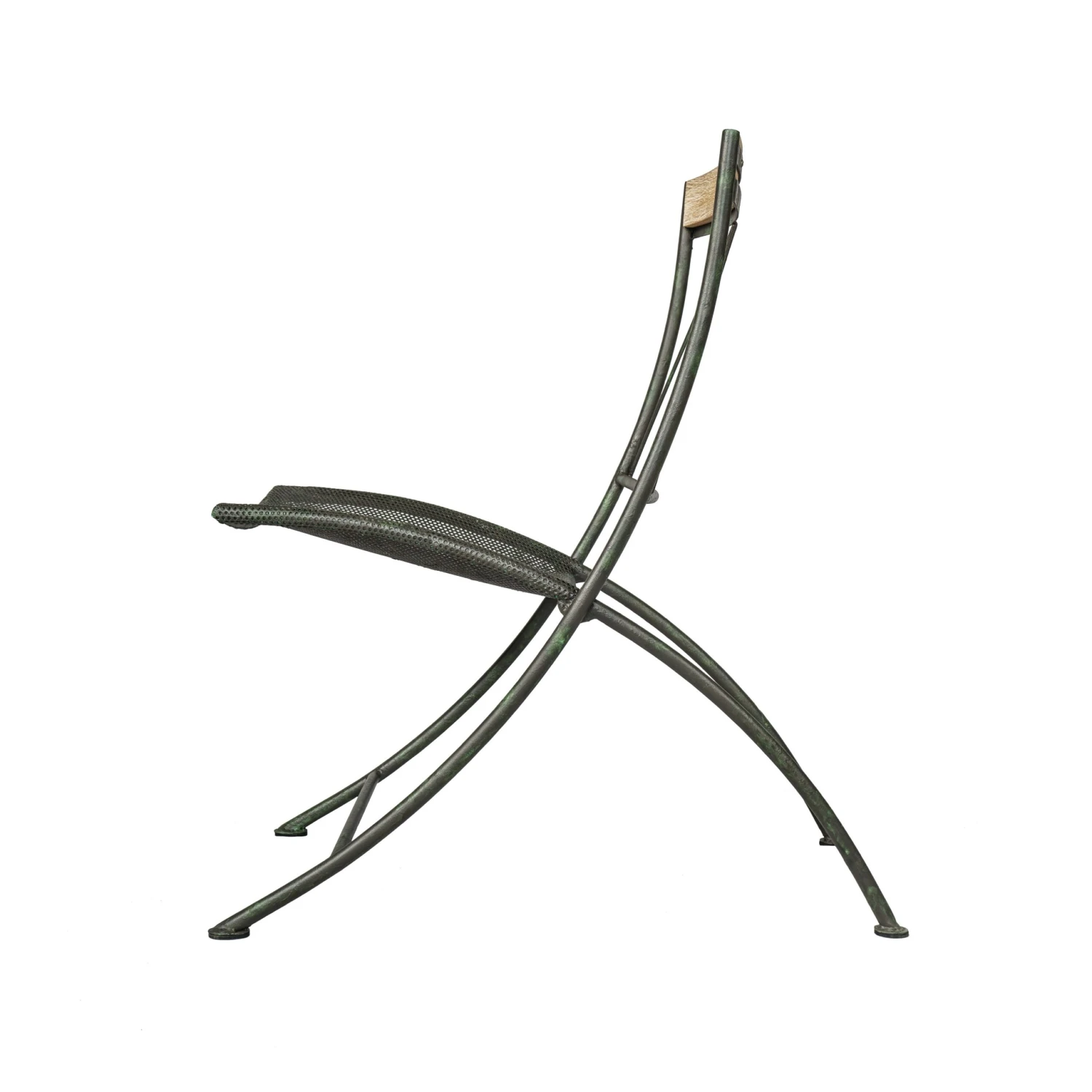 The interplay of graceful curves and straight lines makes this garden chair a standout, as does the juxtaposition of the teak strip within the metal seat back. The chairs are stackable for easy storage.