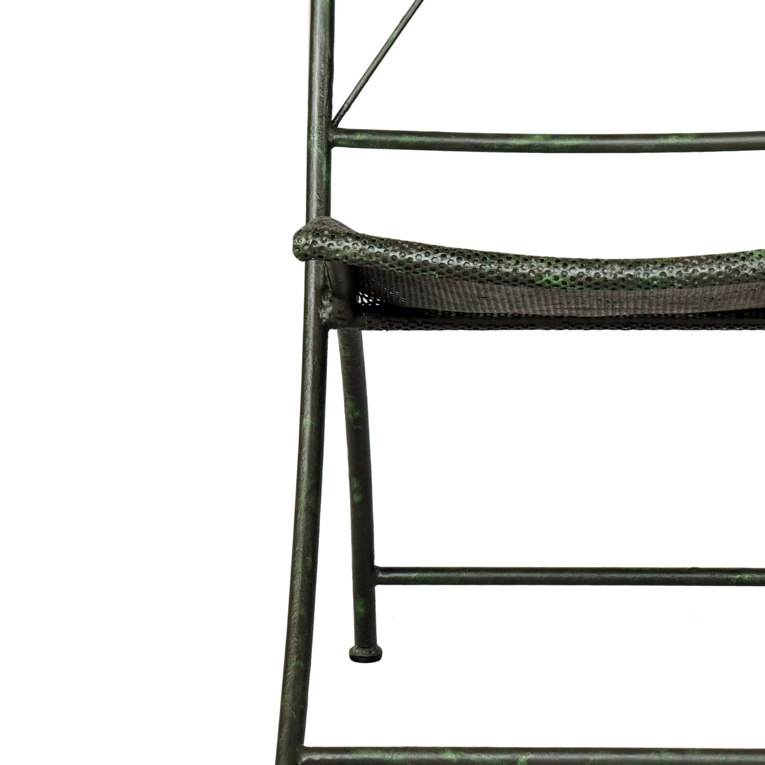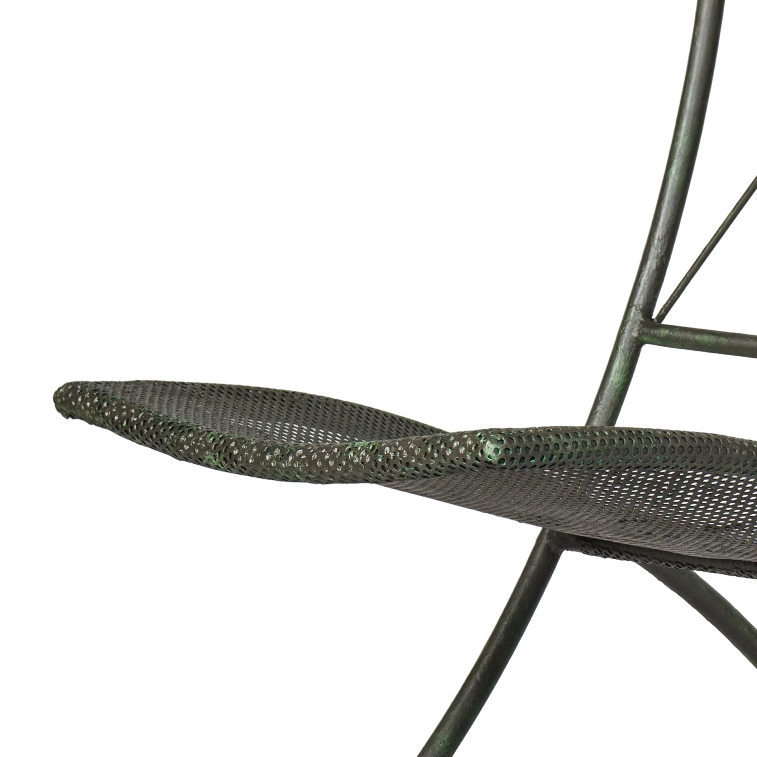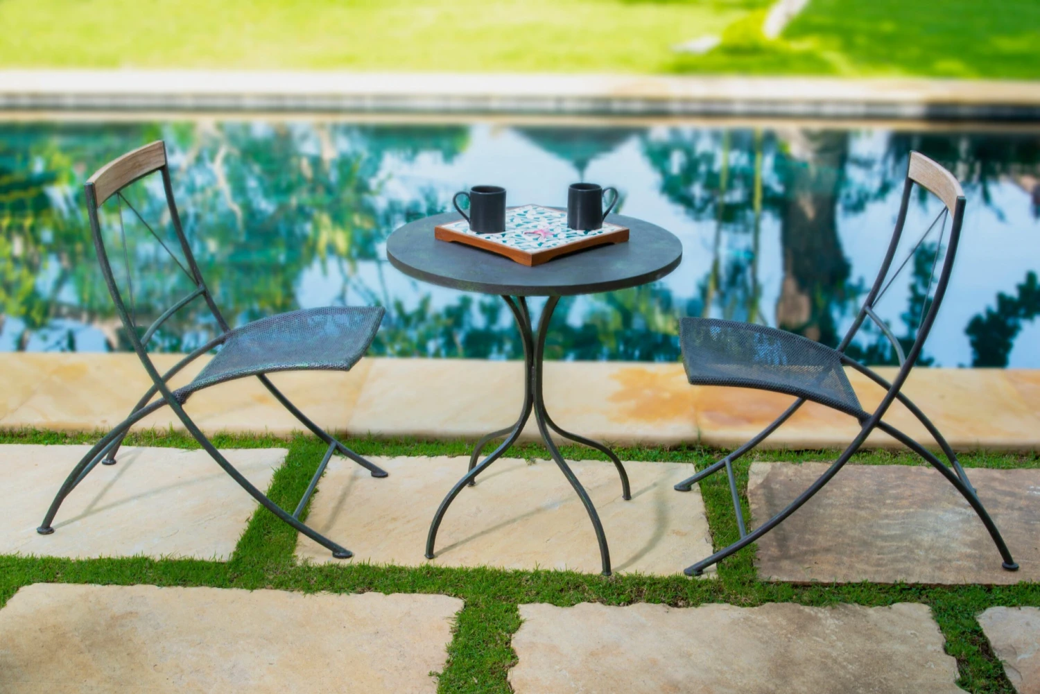 The interplay of graceful curves and straight lines makes this garden chair a standout, as does the juxtaposition of the teak strip within the metal seat back. The chairs are stackable for easy storage.