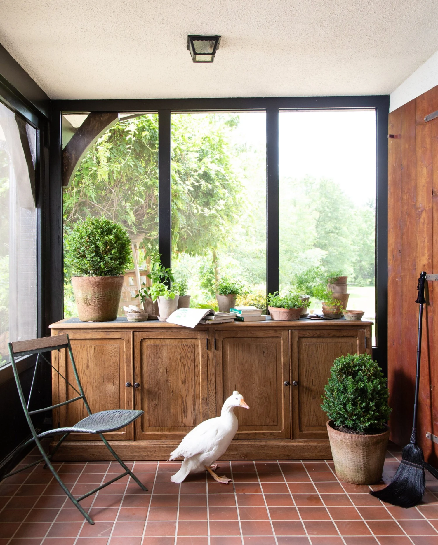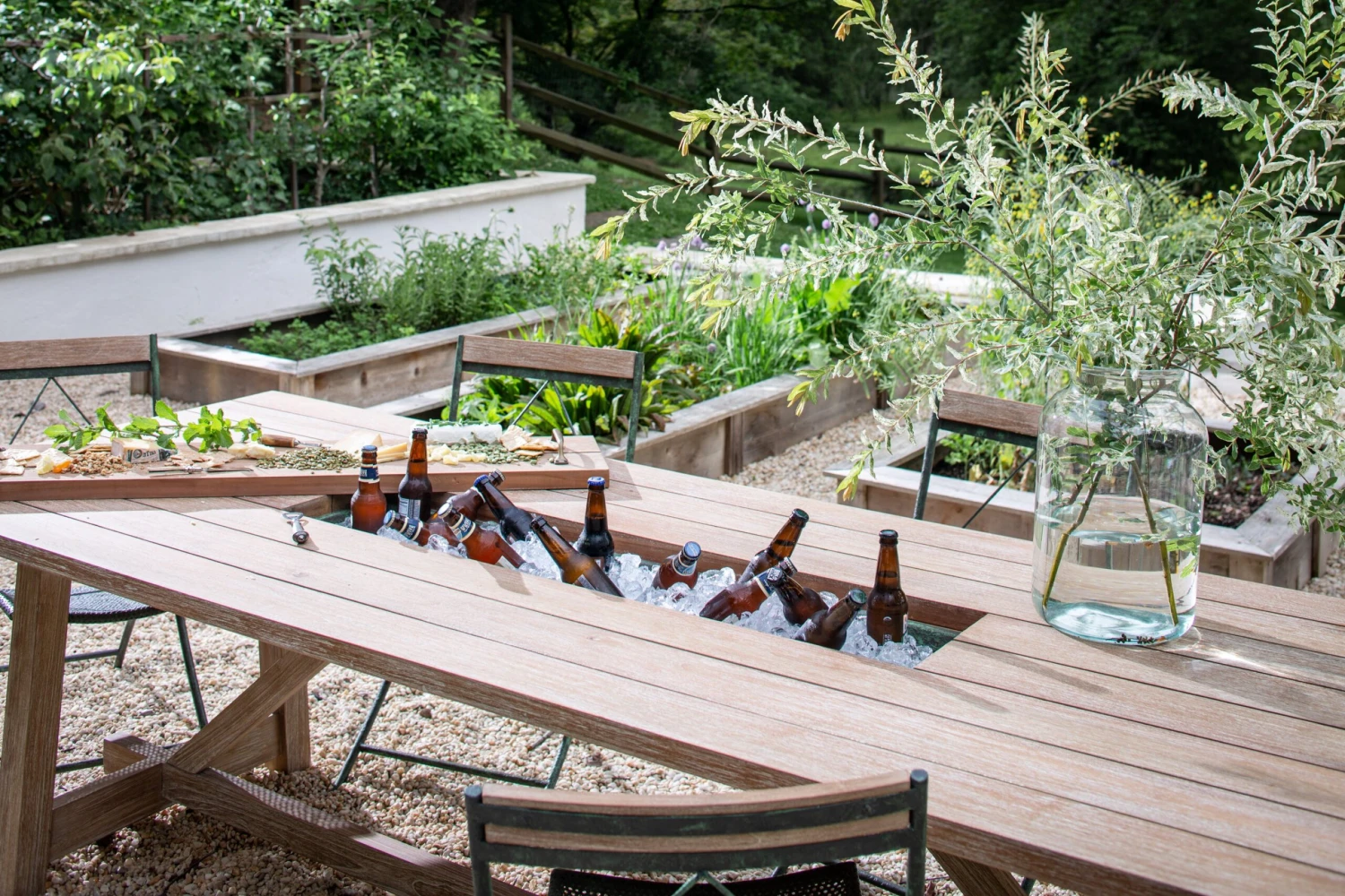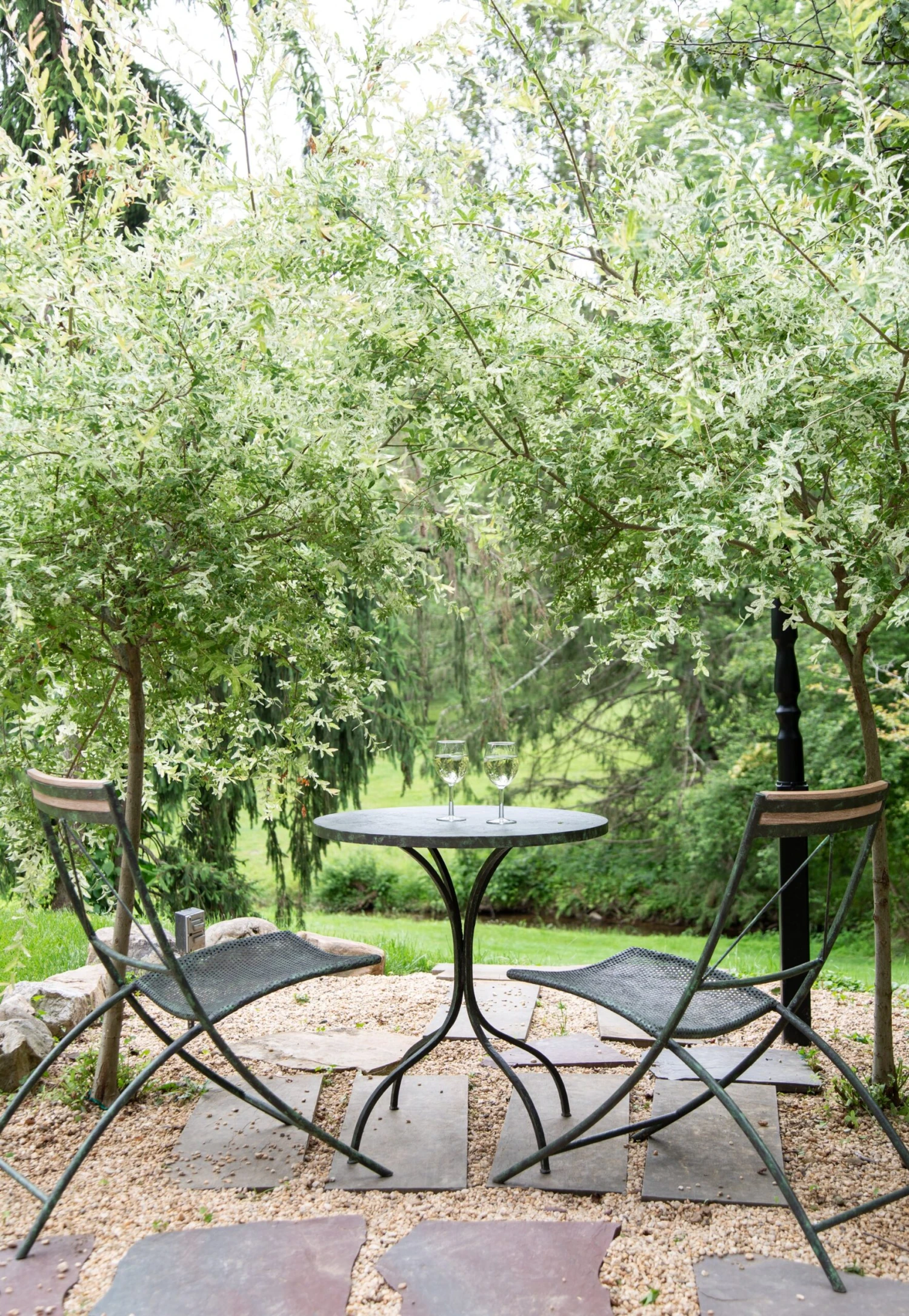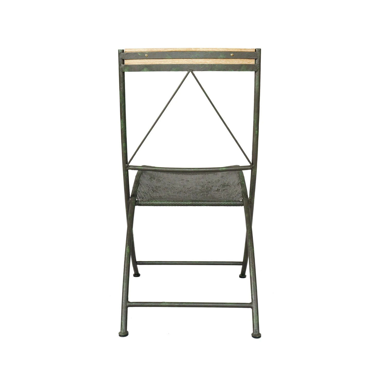 The interplay of graceful curves and straight lines makes this garden chair a standout, as does the juxtaposition of the teak strip within the metal seat back. The chairs are stackable for easy storage.